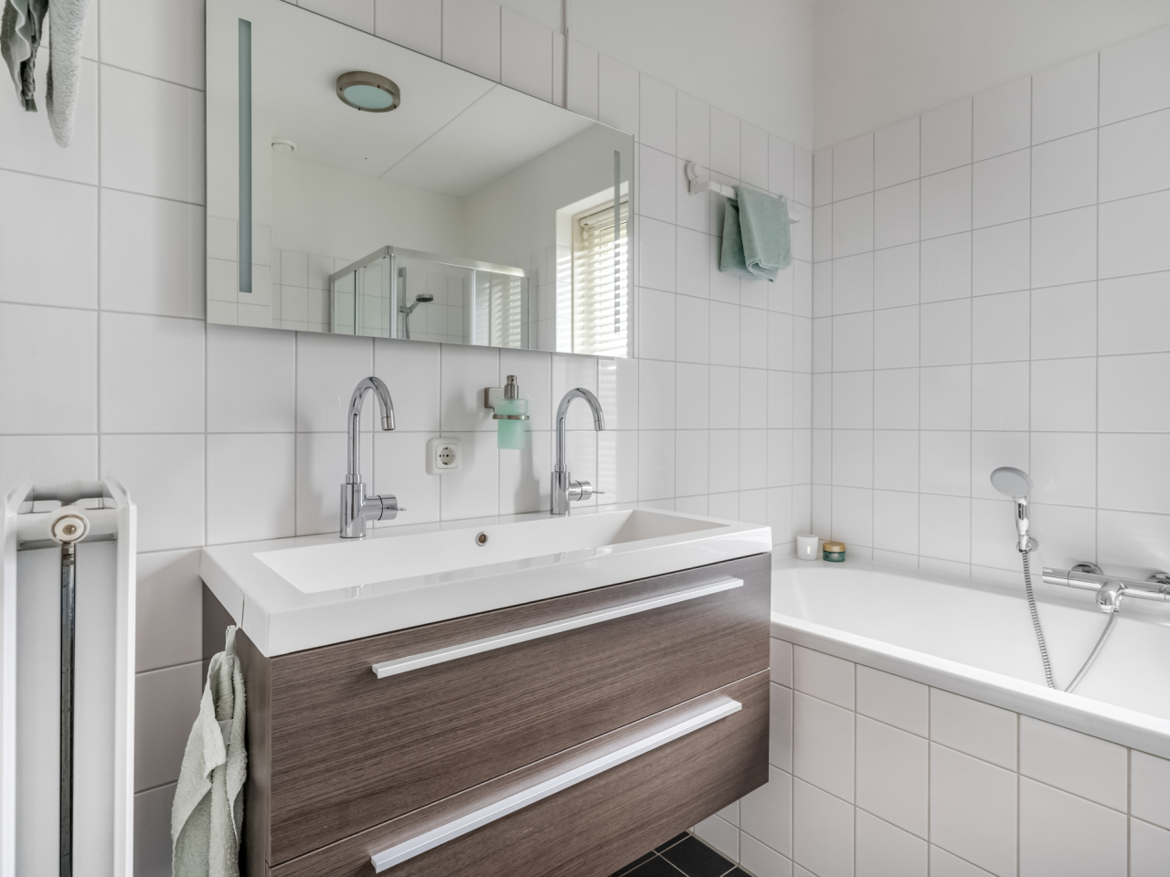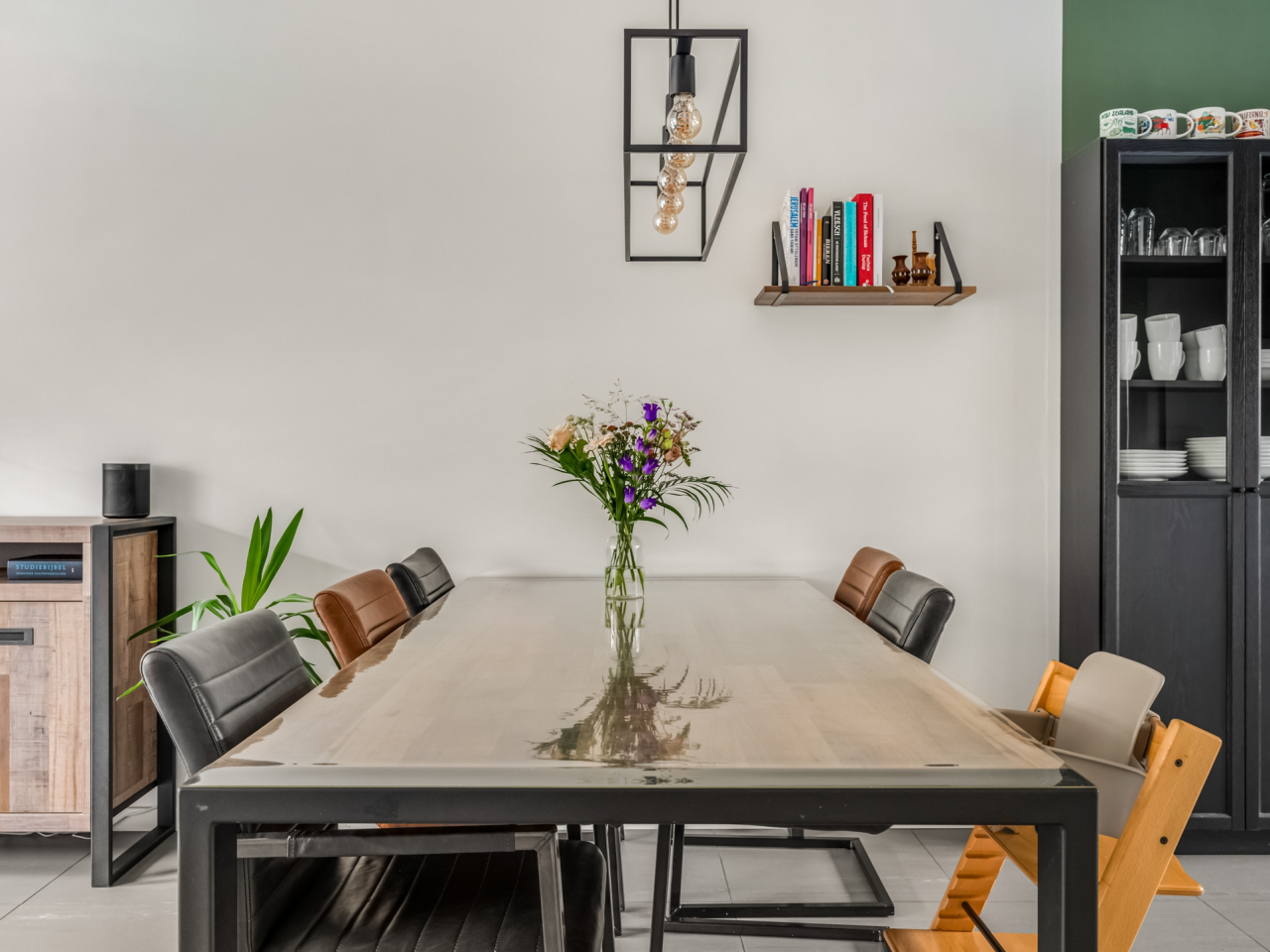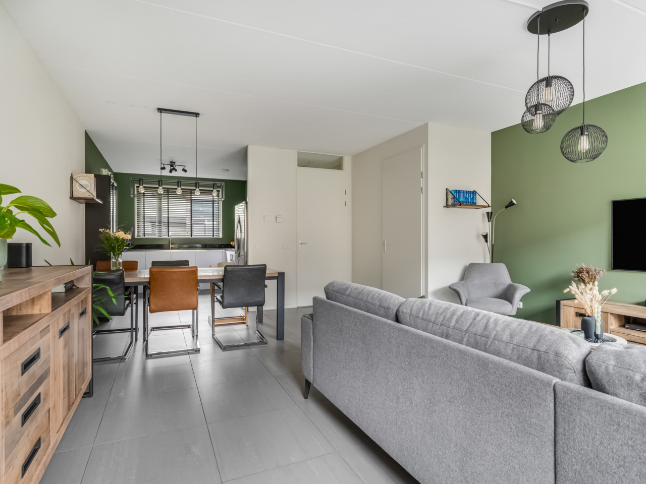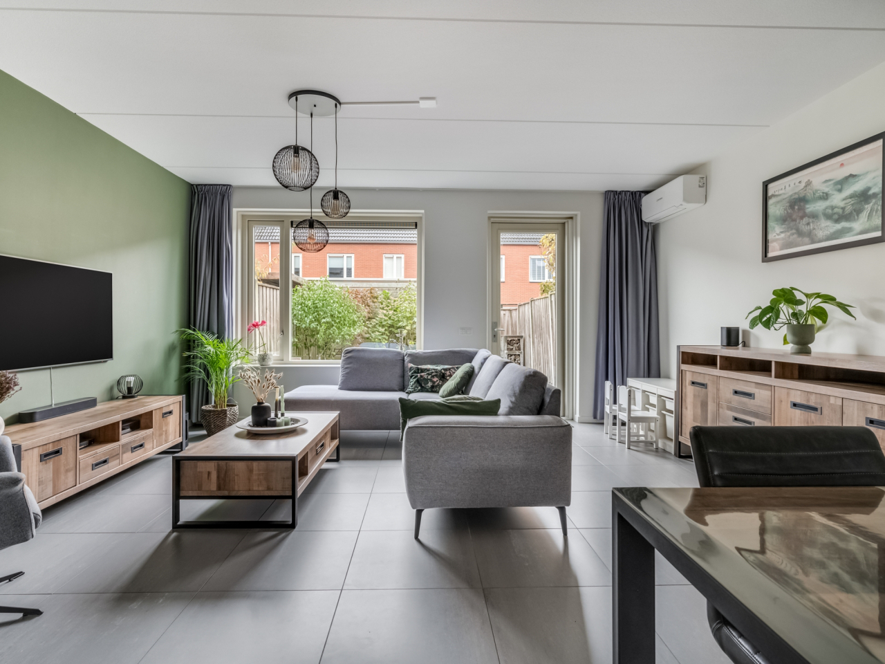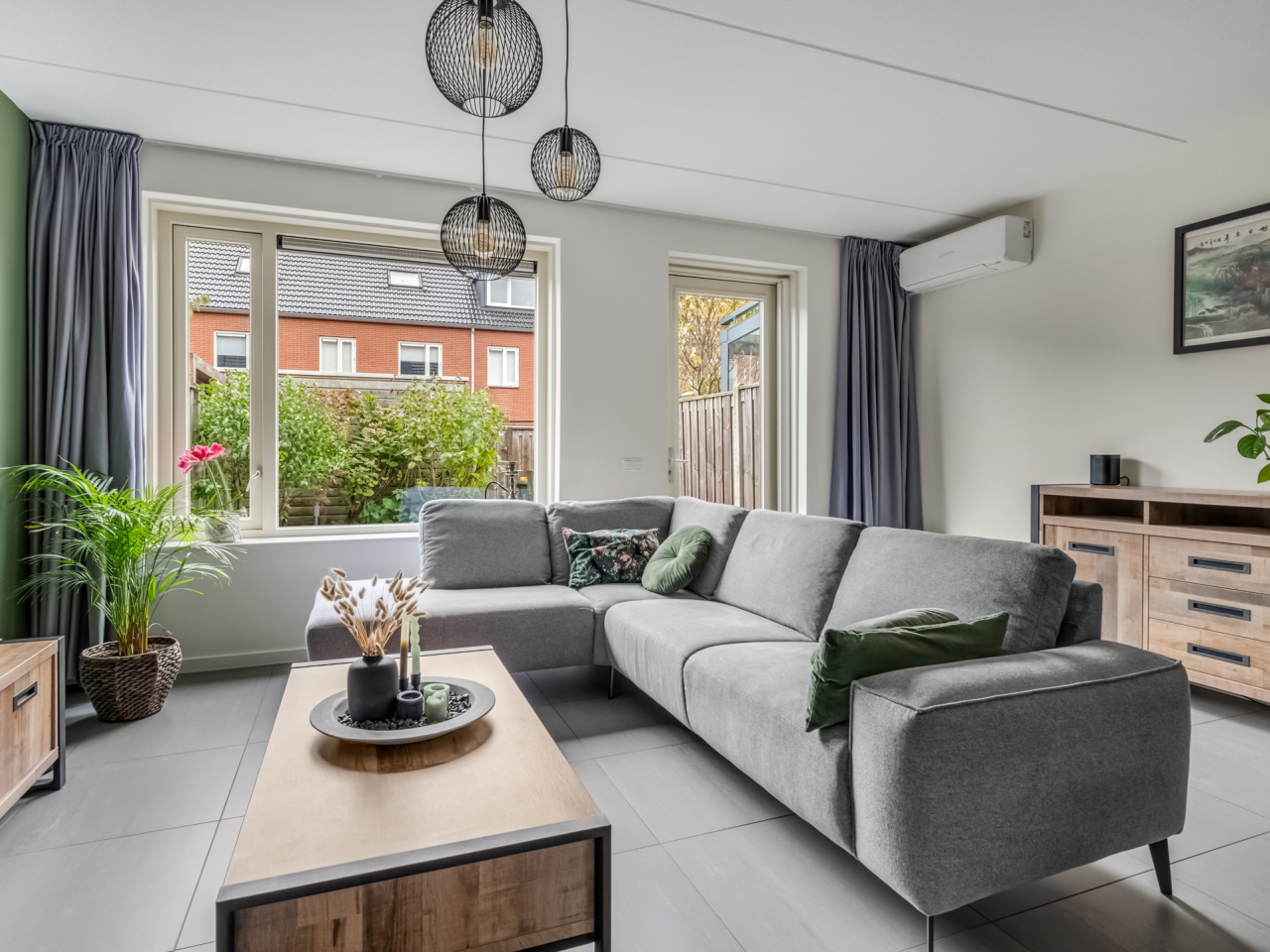 De tuingerichte woonkamer is heerlijk licht, beschikt over een deur naar de achtertuin en een praktische trapkast. De strakke afwerking maakt dat verhuizen hier direct mogelijk is. Door de recent geïnstalleerde airconditioning blijft het hier ook in de zomer heerlijk koel.