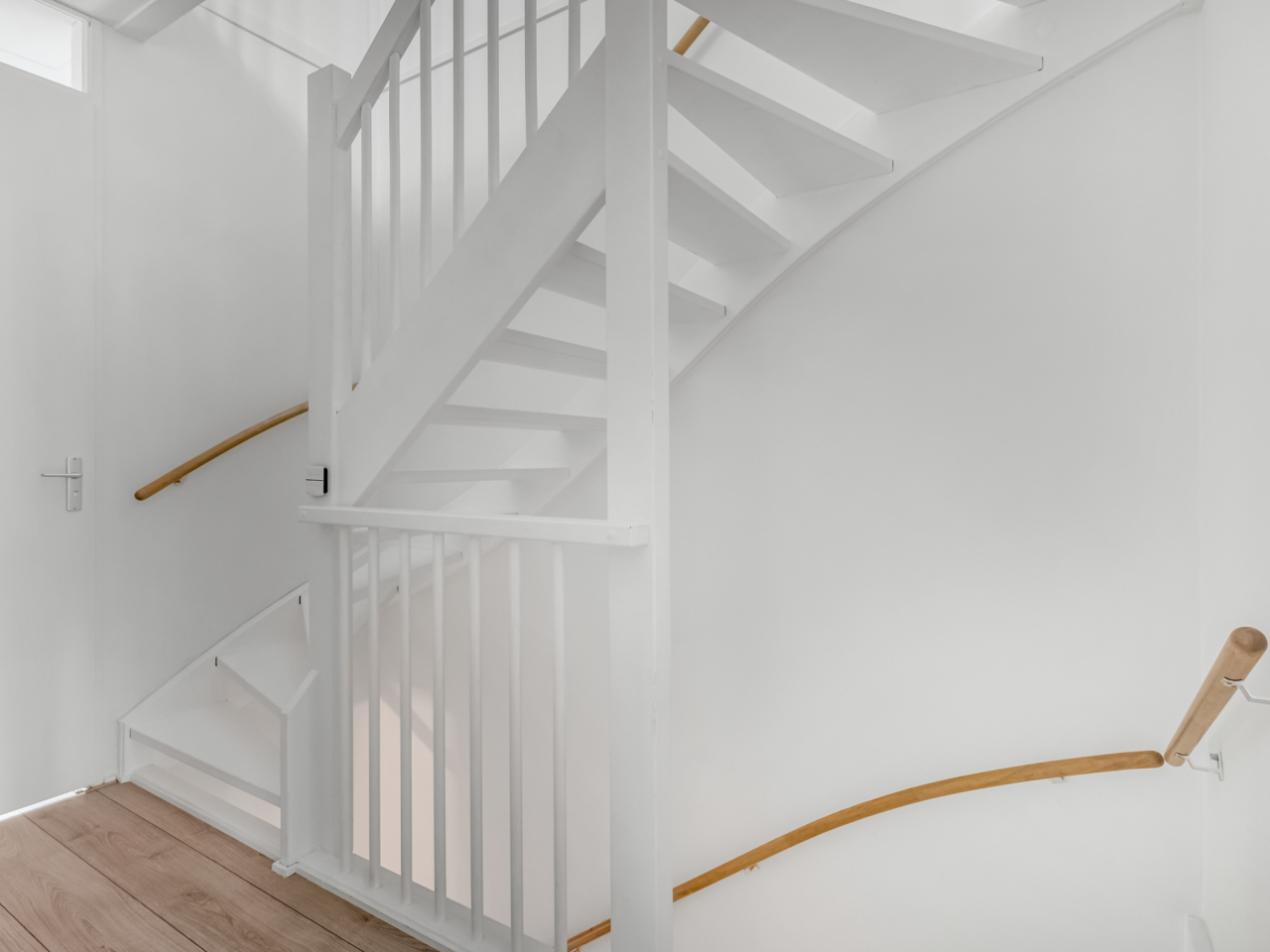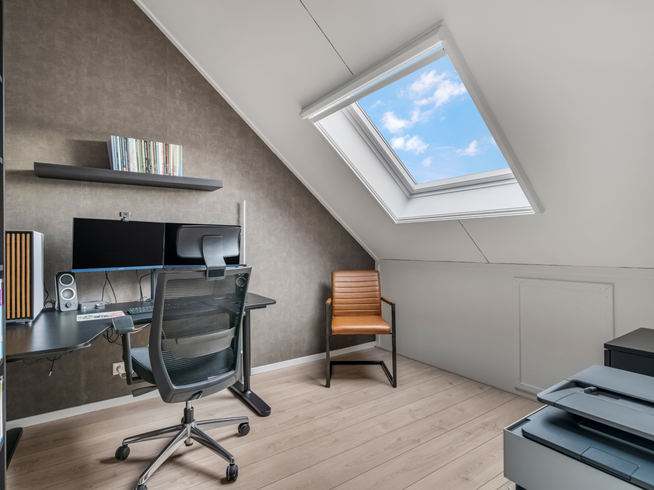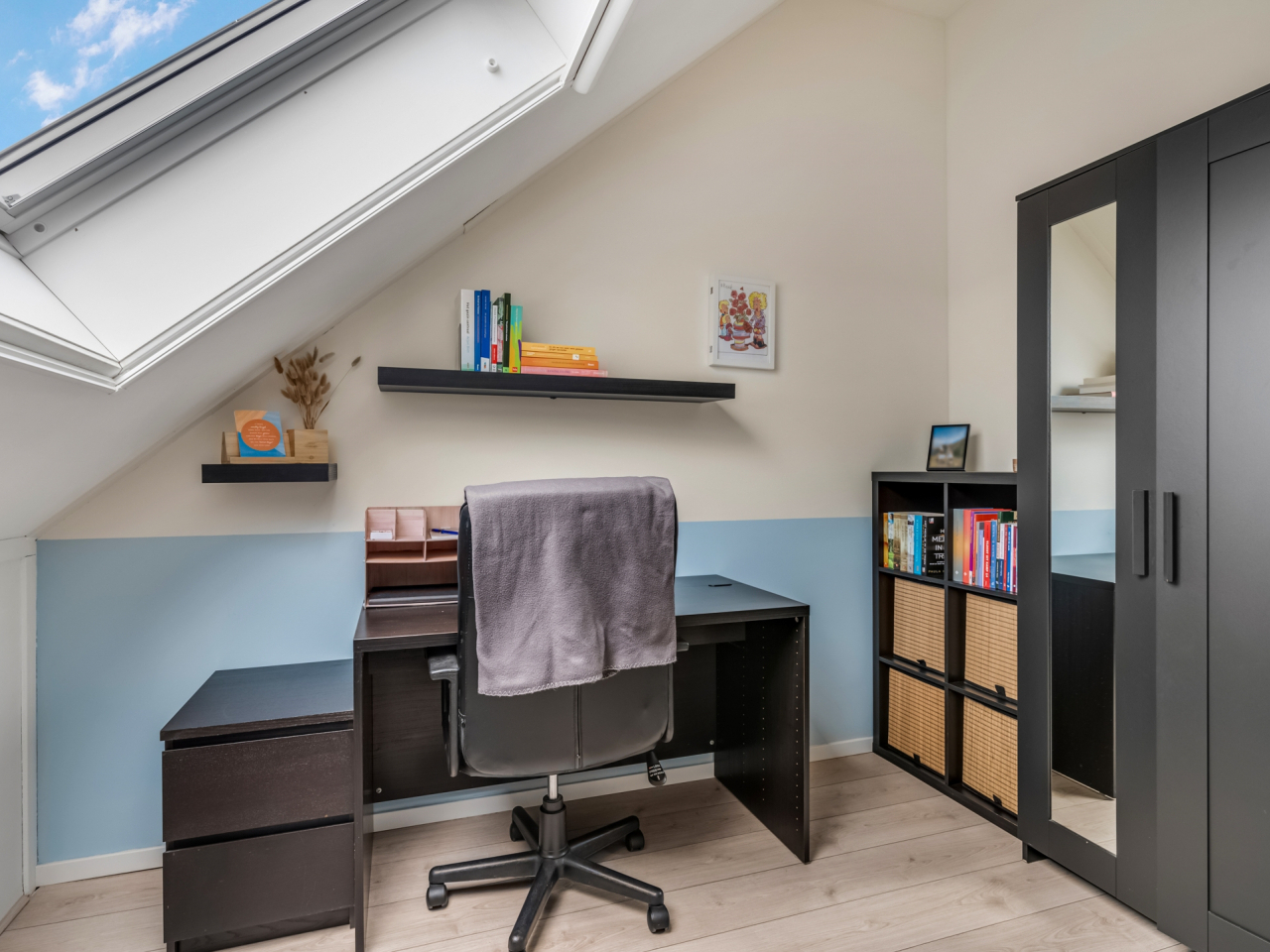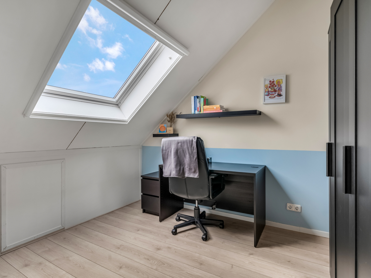 Via een vaste trap kom je op de tweede verdieping waar in 2023 twee volwaardige slaapkamers zijn gerealiseerd, beide met grote dakramen. Hier bevinden zich tevens de cv-ketel (Intergas, 2014) en de wasmachineaansluiting. Ook deze verdieping is netjes afgewerkt met laminaat en lichte wandafwerking. Achter de knieschotten is nog extra opbergruimte aanwezig.