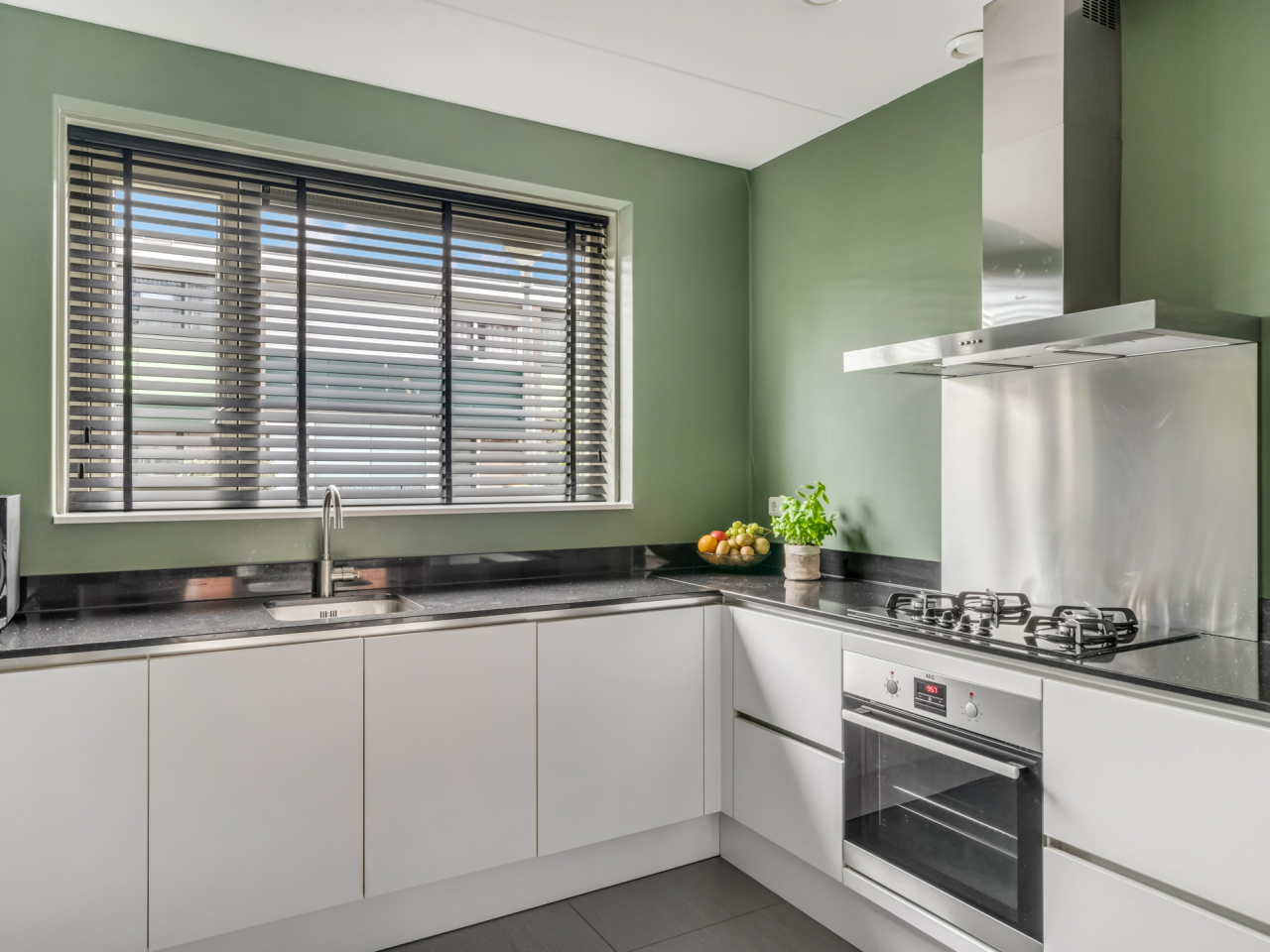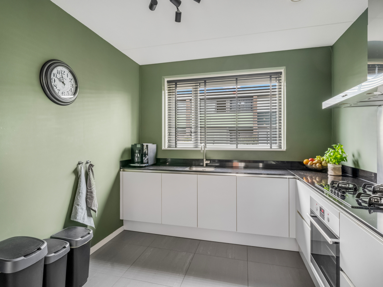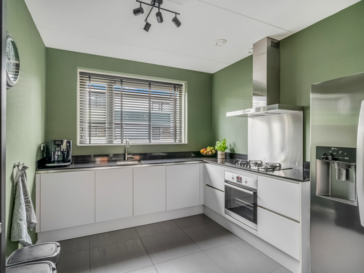 Aan de voorzijde bevindt zich de open keuken met moderne hoekopstelling en alle gewenste inbouwapparatuur, waaronder een gaskookplaat met afzuigkap, oven (2025), vaatwasser (2025) en een Amerikaanse koel-vriescombinatie (ter overname). Vanuit de keuken kijk je vrij uit over de rustige straat en het groen voor de woning.