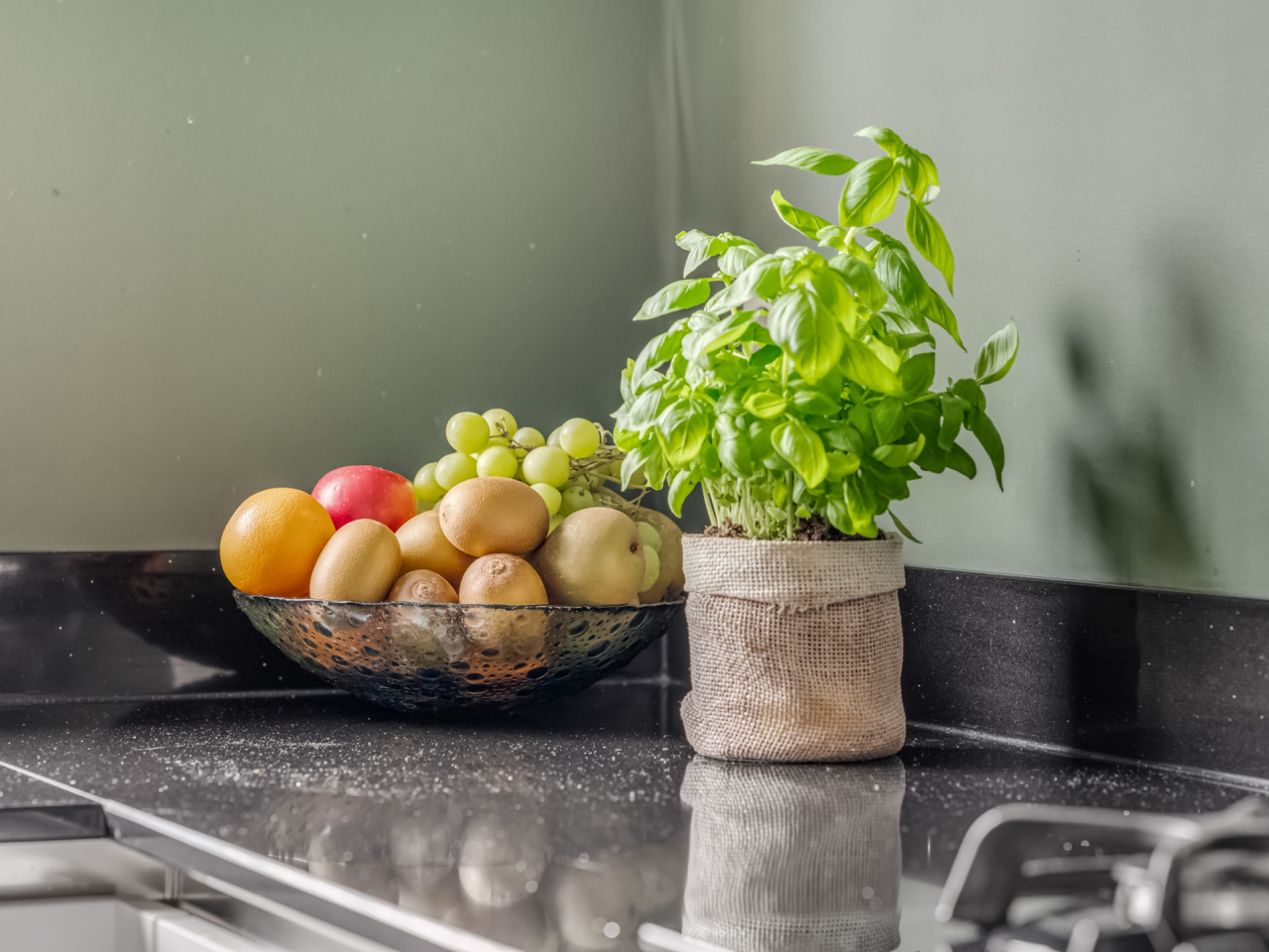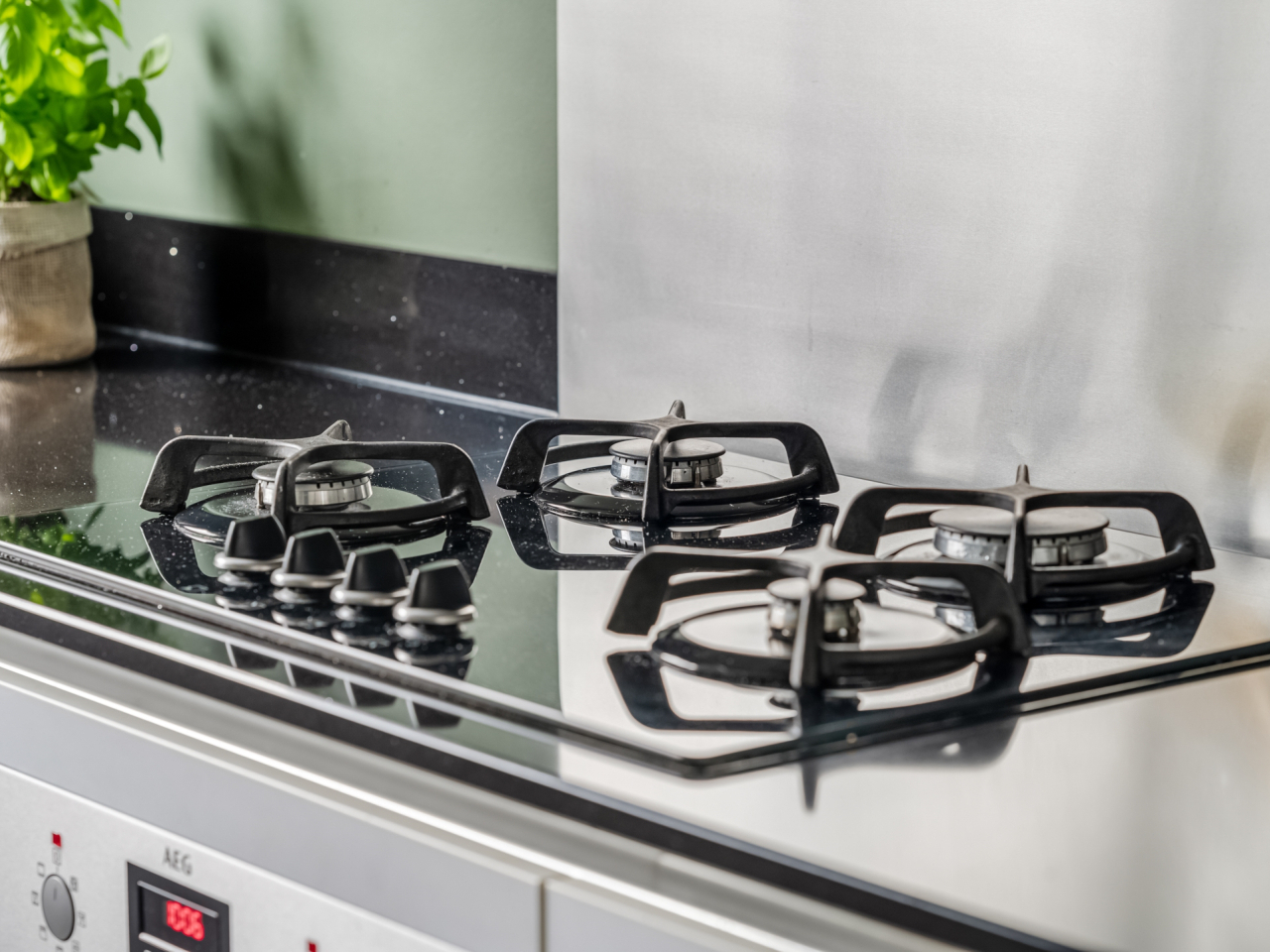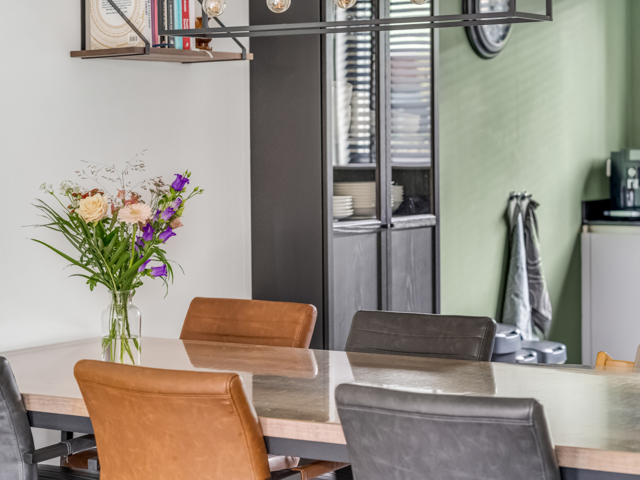 Aan de voorzijde bevindt zich de open keuken met moderne hoekopstelling en alle gewenste inbouwapparatuur, waaronder een gaskookplaat met afzuigkap, oven (2025), vaatwasser (2025) en een Amerikaanse koel-vriescombinatie (ter overname). Vanuit de keuken kijk je vrij uit over de rustige straat en het groen voor de woning.