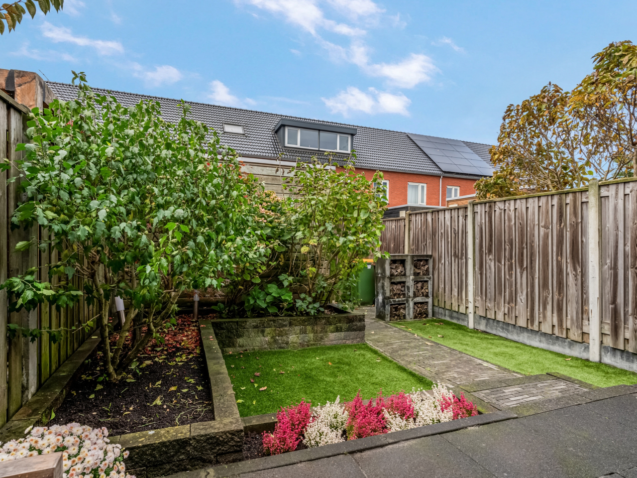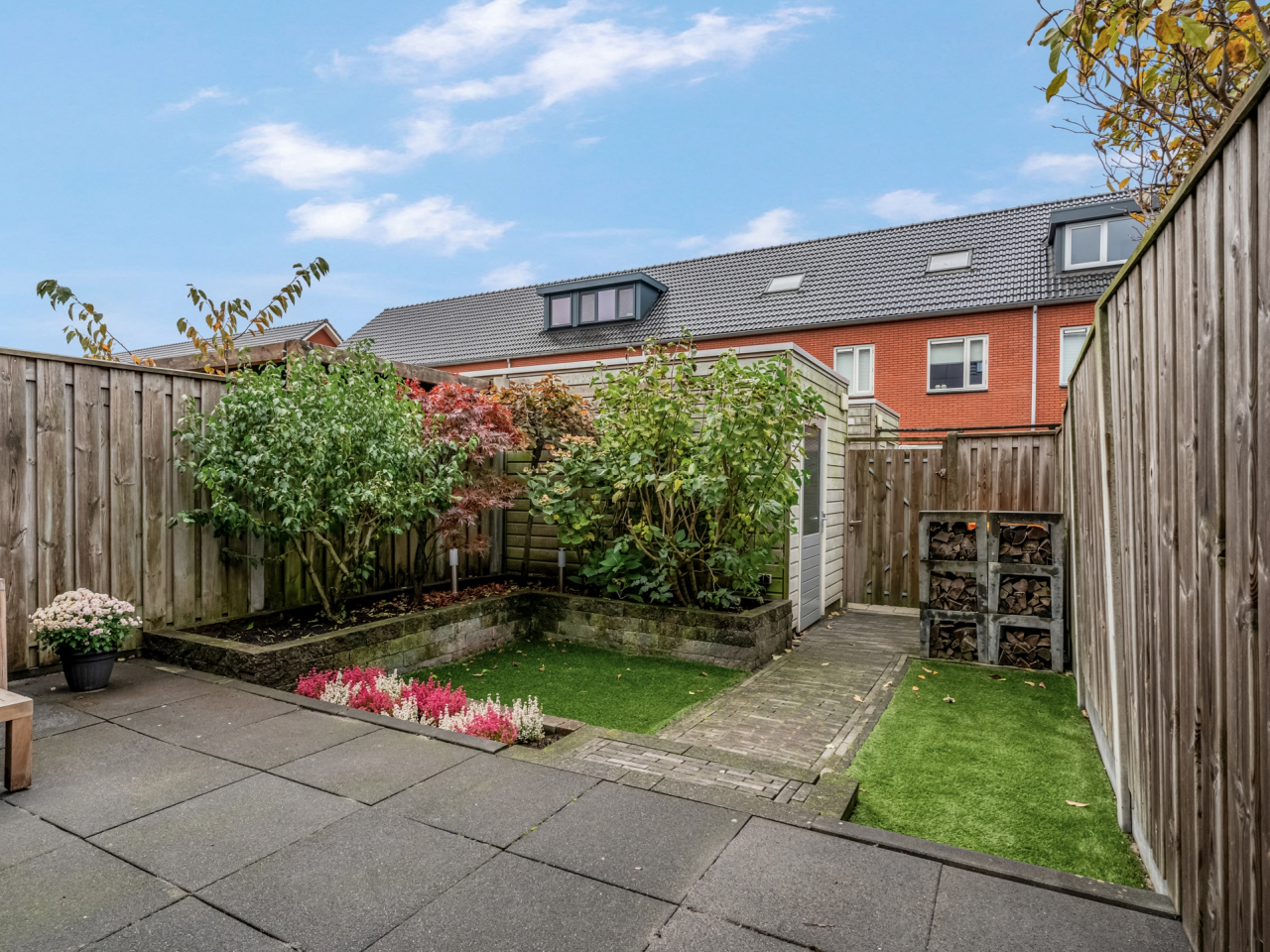 De zonnige achtertuin ligt op het zuidwesten, waardoor je al vroeg in het voorjaar van de zon kunt genieten. De tuin is verzorgd aangelegd met een ruim terras, verhoogde borders, twee grasgedeelten en een houten berging. Aan de achtergevel hangt een breed, elektrisch bedienbaar zonnescherm. Via de poort bereik je de gezamenlijke achterom.
