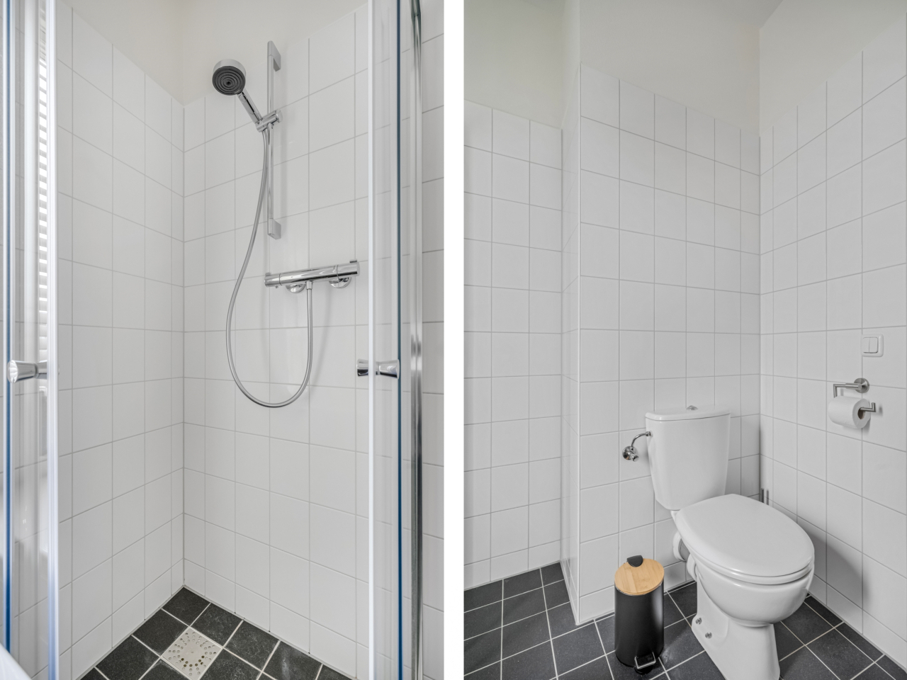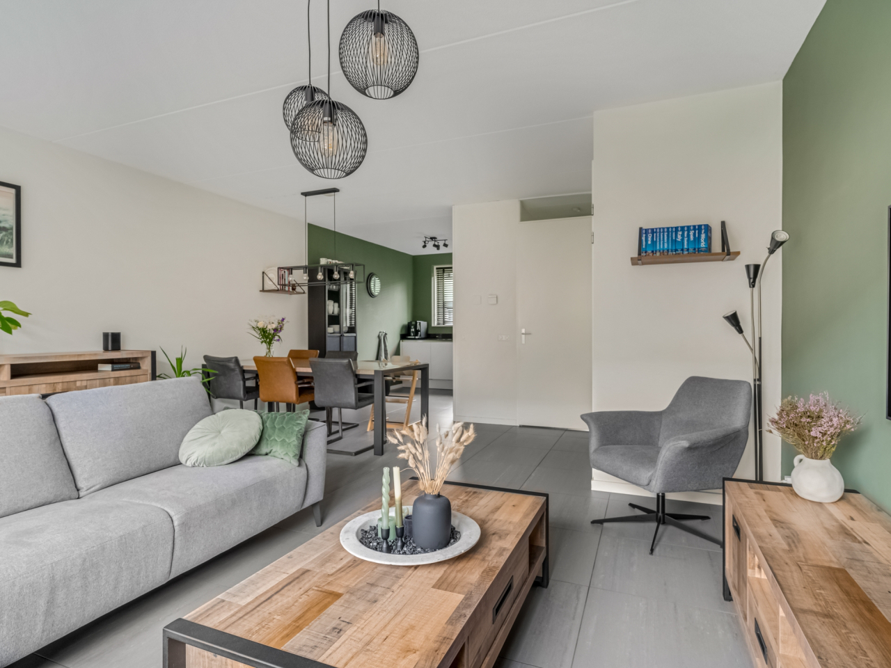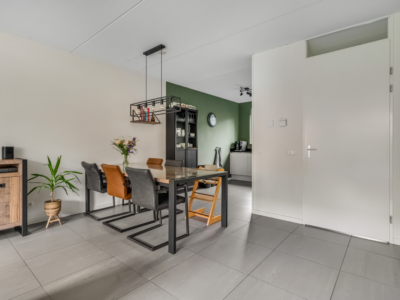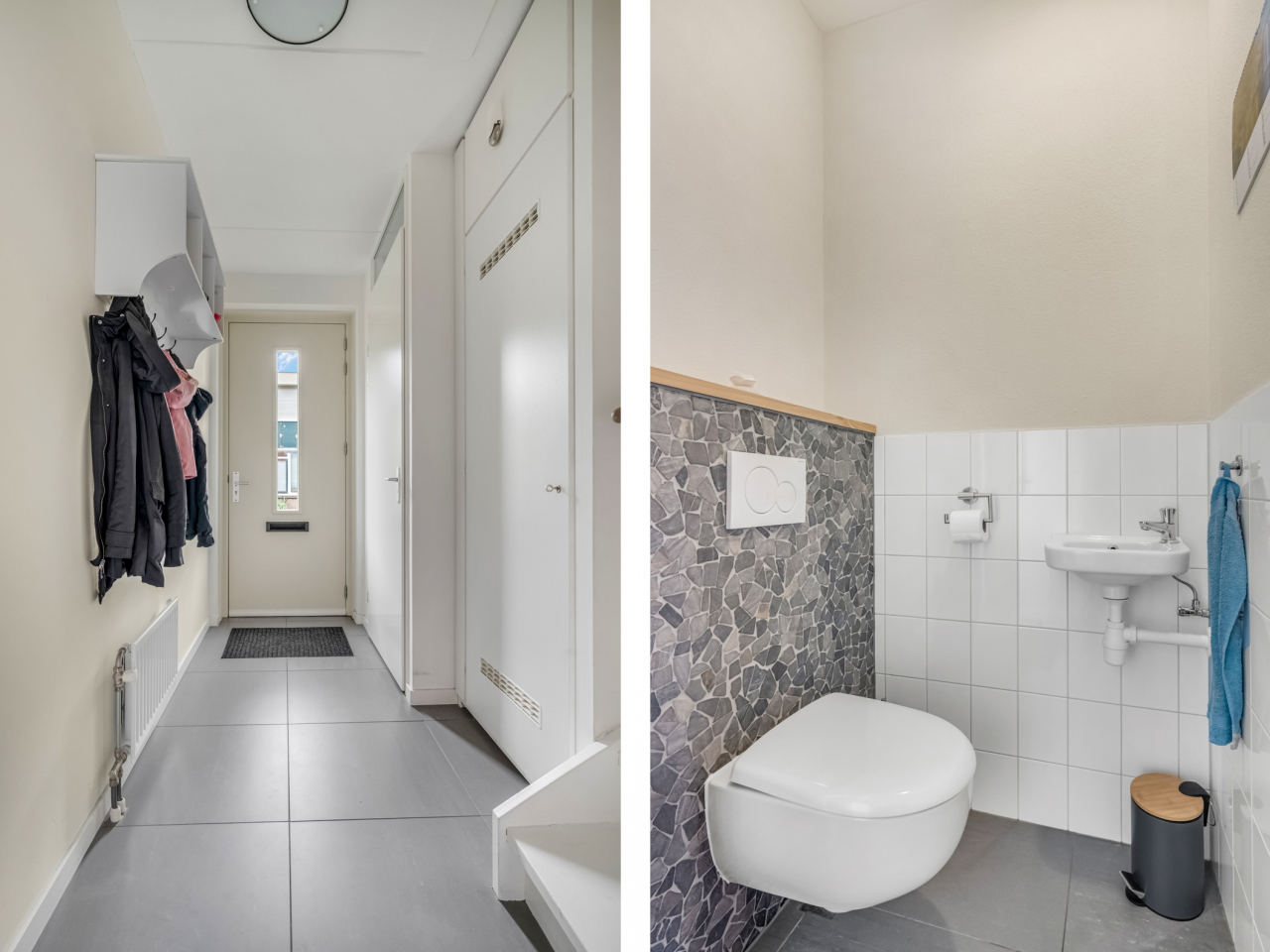 De woning is van hal tot zolder keurig afgewerkt. In de hal bevinden zich de vernieuwde toiletruimte (2022), de meterkast en de trapopgang. De stijlvolle grijze tegelvloer met comfortabele vloerverwarming loopt door over de gehele begane grond en zorgt voor een luxe uitstraling.