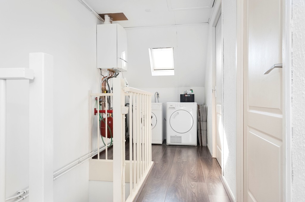Voorzolder met aansluitingen voor wasmachine en droger. CV-ketel (Remeha Calenta, 2011).