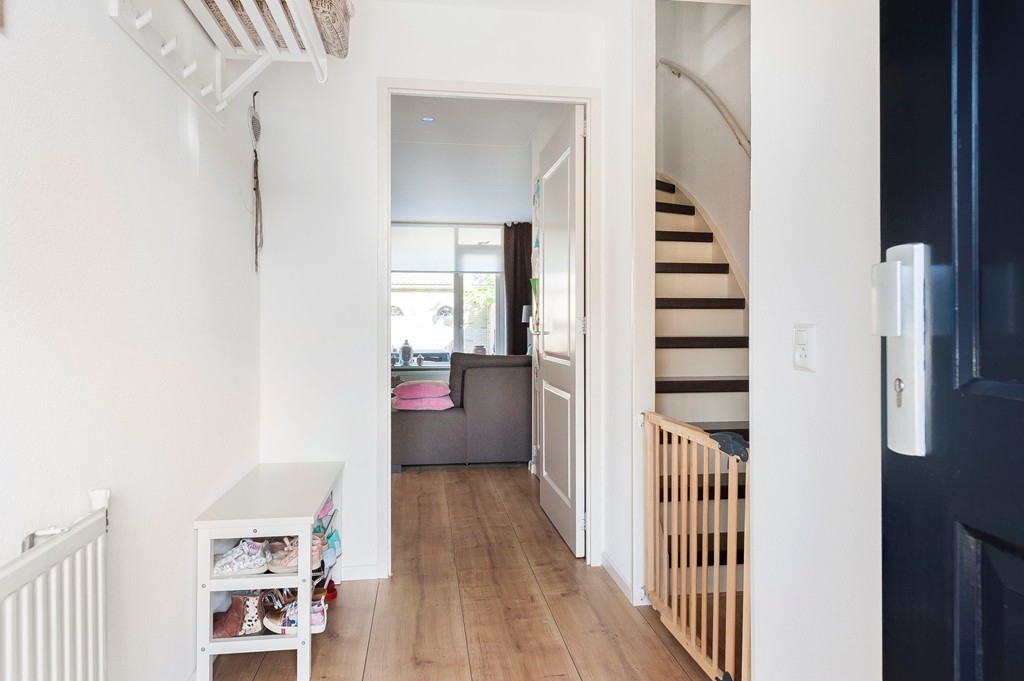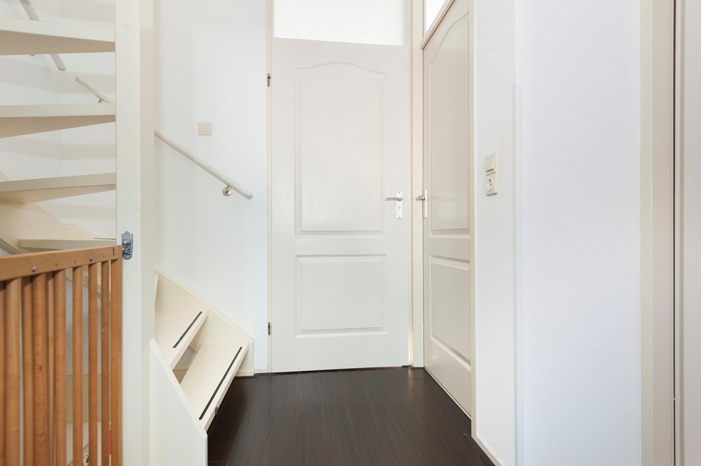 Entree via de hal, toilet met fonteintje en meterkast. Toegang tot de tuingerichte woonkamer die een deur heeft naar het terras. De woonkamer is voorzien van een mooie laminaatvloer. De grote raampartij aan de achterzijde maakt de ruimte heerlijk licht. Voorts is er een trapkast aanwezig die ruim voldoende opbergruimte biedt.