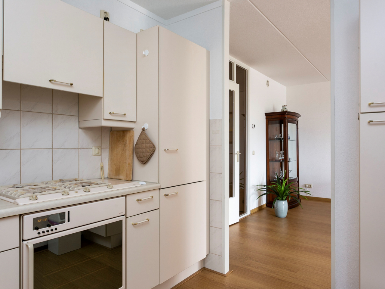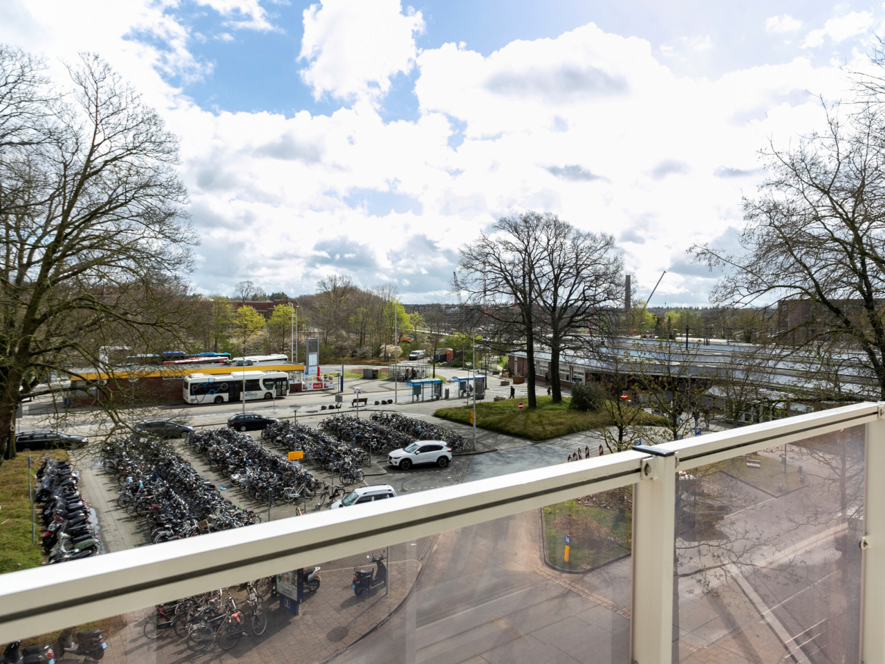 De keuken is voorzien van diverse inbouwapparatuur zoals een gaskookplaat, afzuigkap, oven, koelkast (2019) en vaatwasser (2020). De zeer royale woonkamer heeft een schuifpui naar het tweede balkon aan de voorzijde en een raam aan de zijkant voor extra daglicht. Aan de voorzijde kijkt u uit op het stationsplein en enkele mooie bomen. Doordat het appartement twee balkons heeft is er altijd wel een plekje in de zon te vinden.