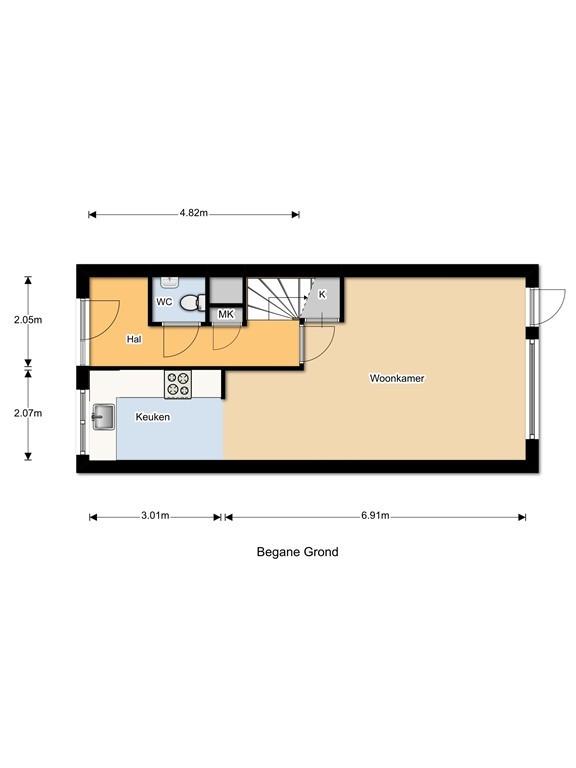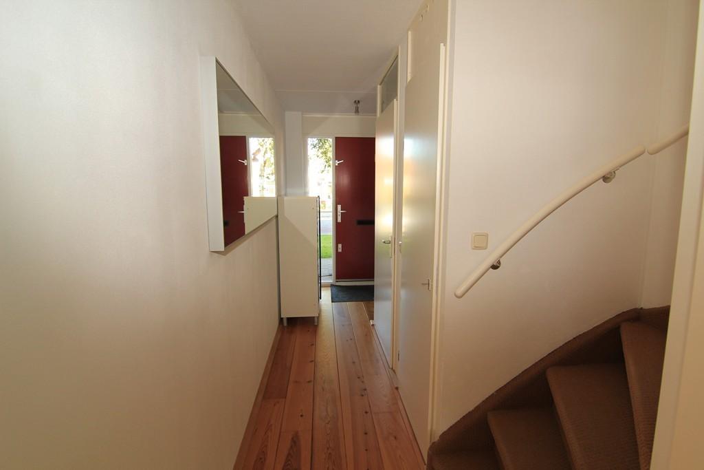 Entree, hal en garderobenis, meterkast en een volledig betegelde toiletruimte met een fonteintje. De gehele benedenverdieping is voorzien van een houten vloer, die in combinatie met de licht afgewerkte woonkamer een sfeervol geheel vormt. De woonkamer is gesitueerd aan de achterzijde van de woning en beschikt over een vaste kast en een grote raampartij alsmede een deur naar de tuin.