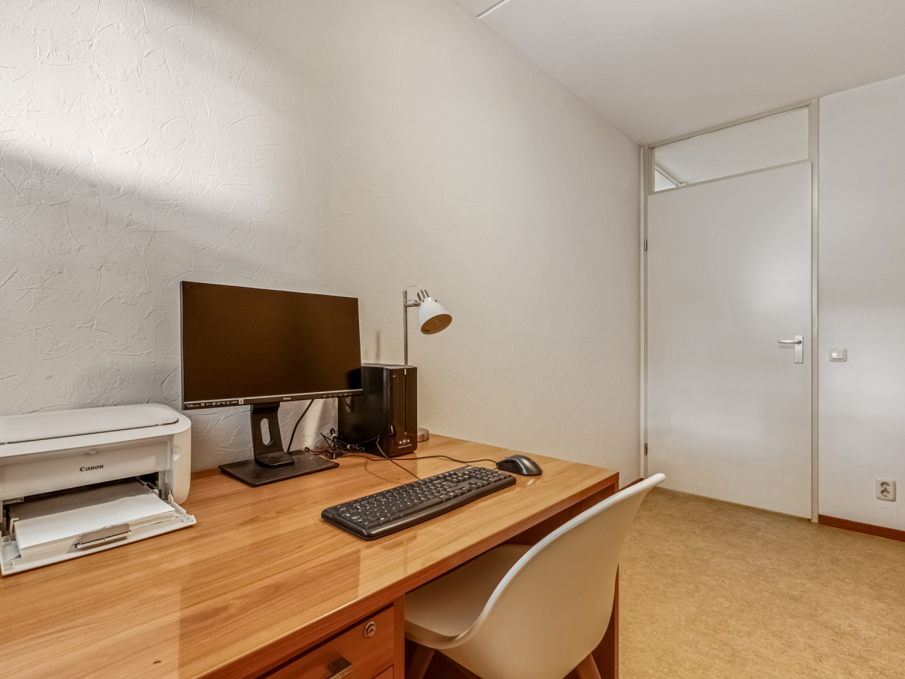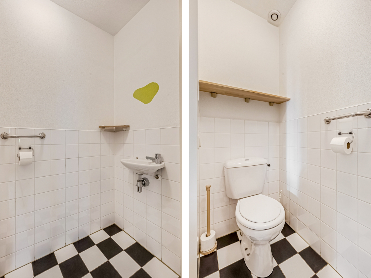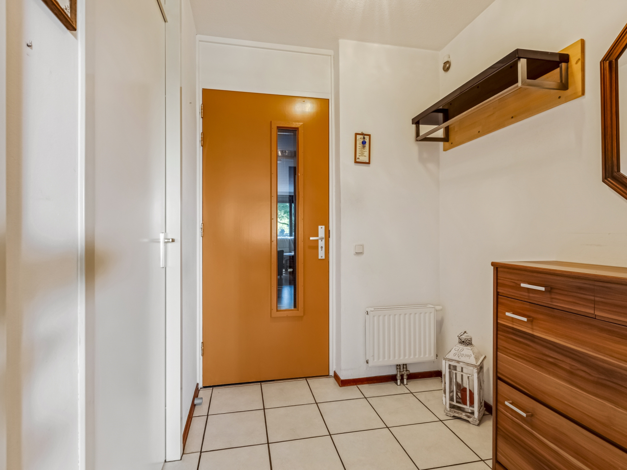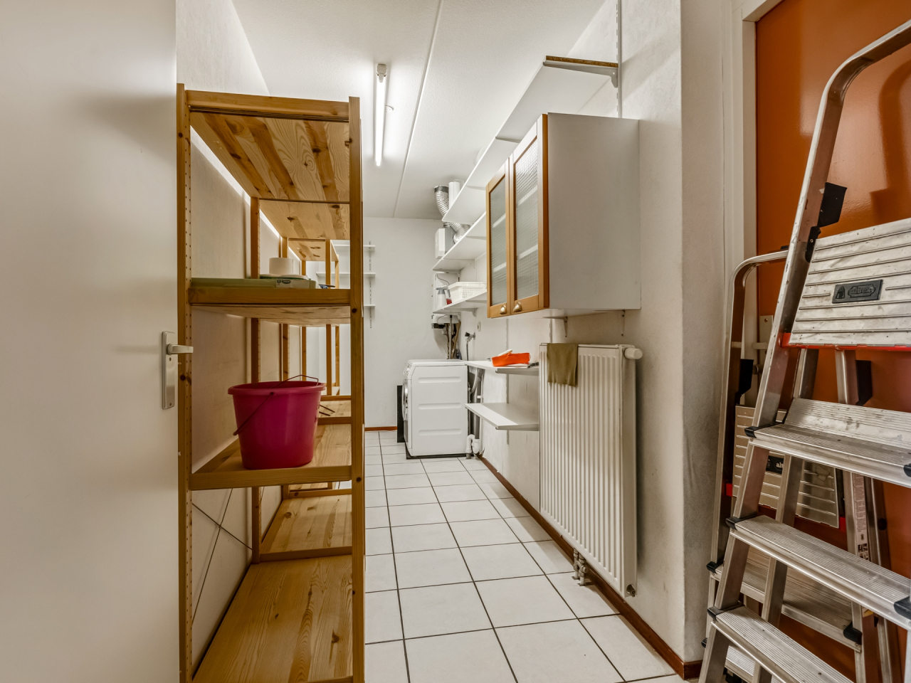 Entree, hal met garderobe die toegang biedt tot de woonkamer, keuken en een inpandige verwarmde berging (7 m²) die eveneens rechtstreeks van buiten bereikbaar is, met aansluitingen voor de wasapparatuur, CV-ketel (2020), mechanische ventilatie en voldoende opbergruimte.