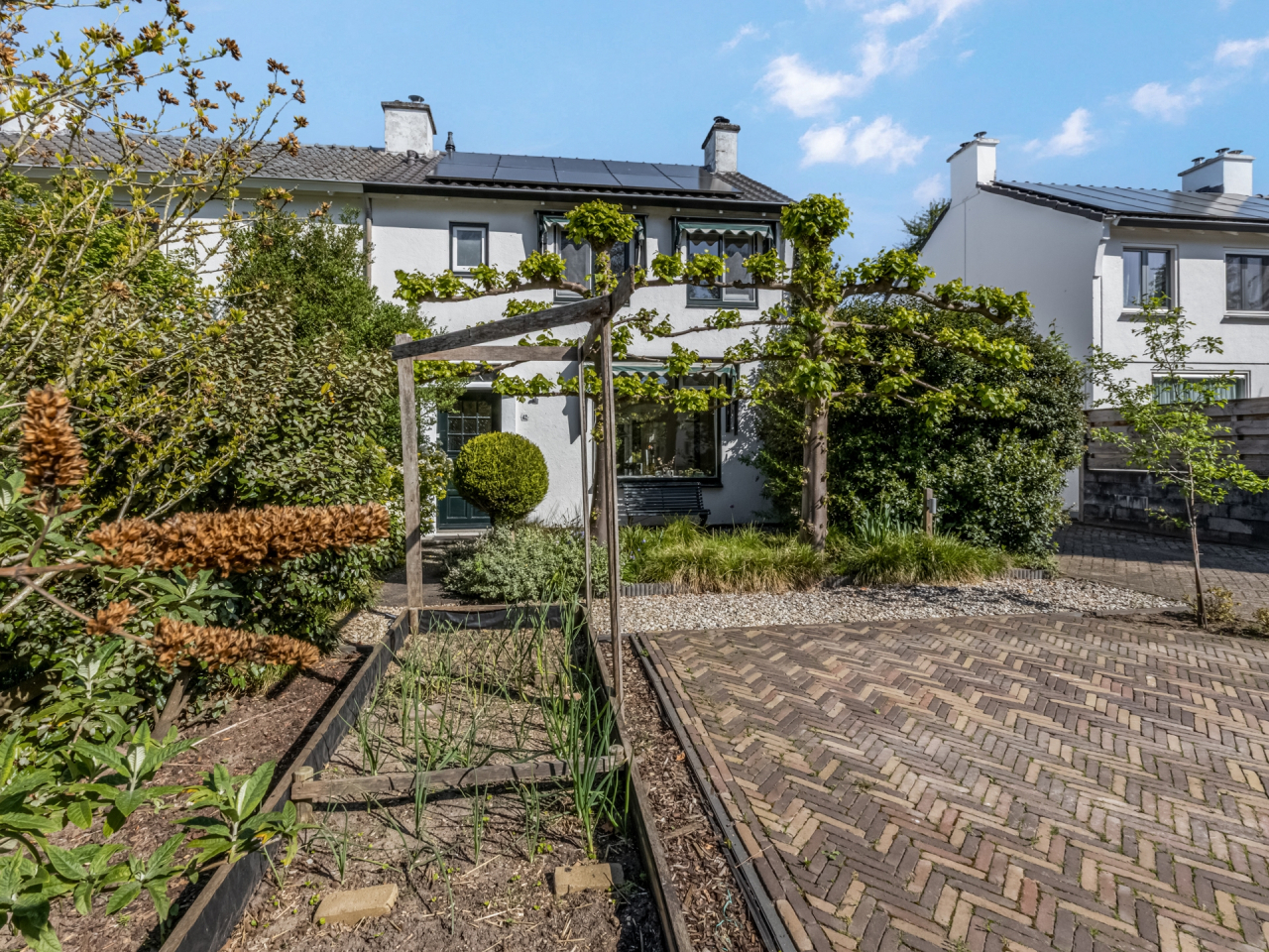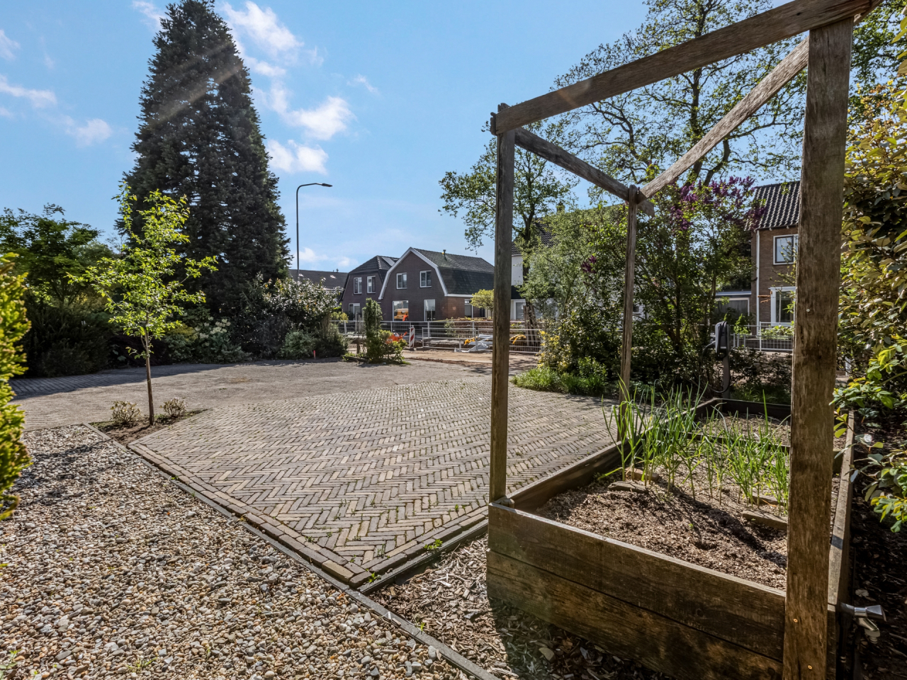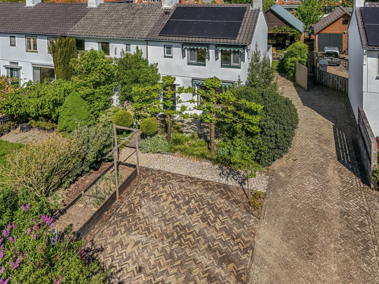 Ruime voortuin met parkeerplaatsen en veel groen. De fraai aangelegde achtertuin (2022) is weliswaar op het noorden gelegen maar is zo diep dat er altijd wel een plekje in de zon te vinden is. Hier vindt u paden met fraai gelegde klinkers, een grasveldje, een terras met grind en perken met planten. Een heerlijke plek met privacy om te genieten van de mooie dagen.