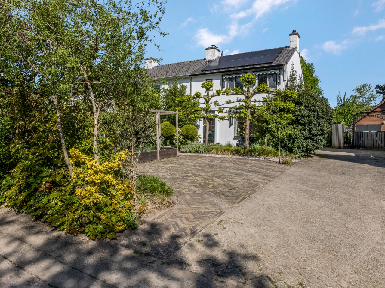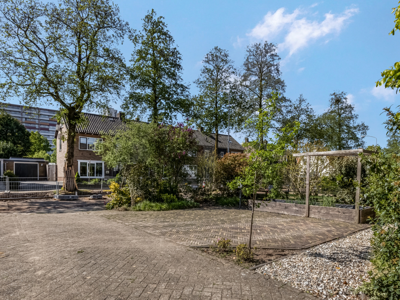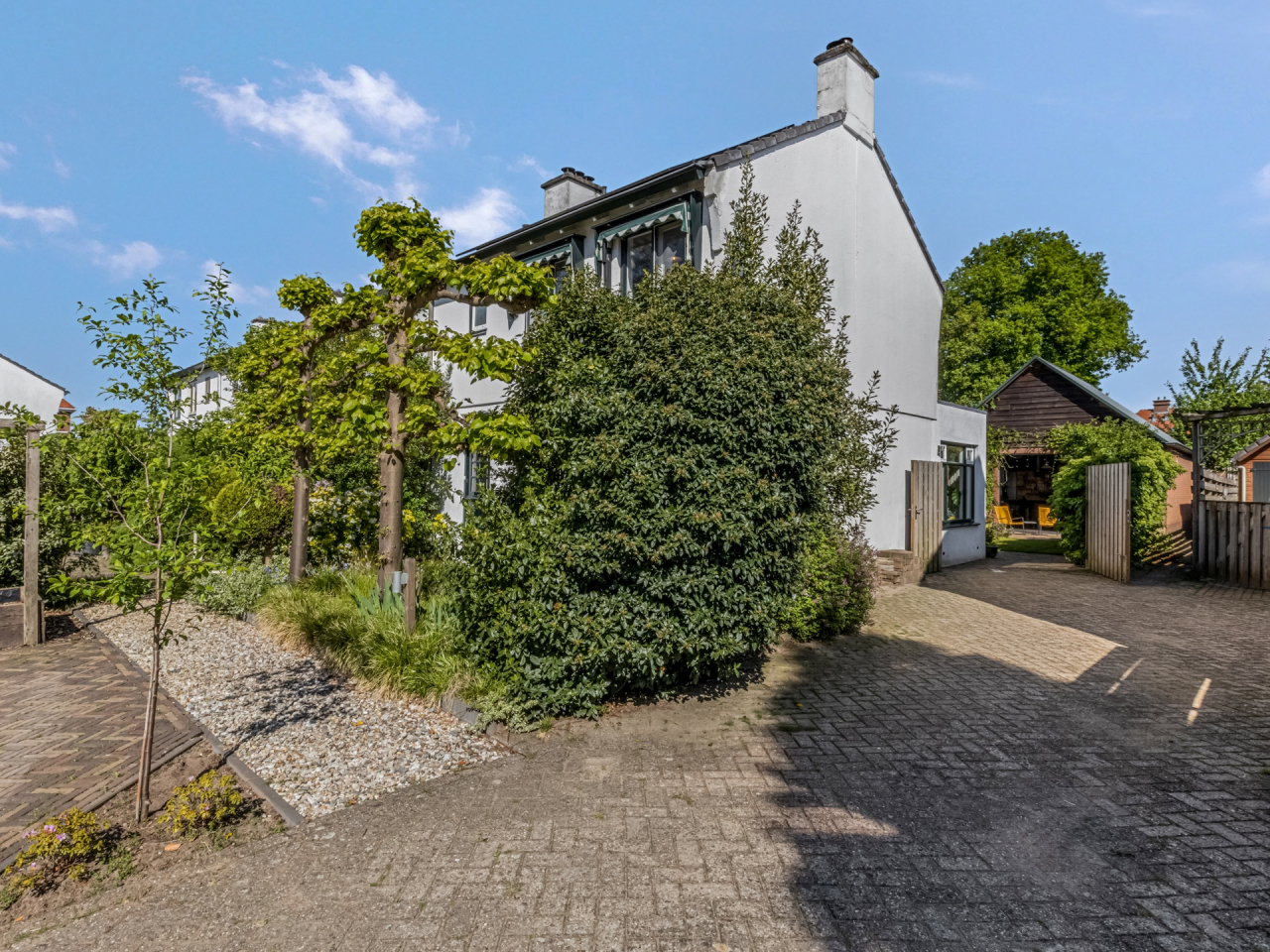 Ruime voortuin met parkeerplaatsen en veel groen. De fraai aangelegde achtertuin (2022) is weliswaar op het noorden gelegen maar is zo diep dat er altijd wel een plekje in de zon te vinden is. Hier vindt u paden met fraai gelegde klinkers, een grasveldje, een terras met grind en perken met planten. Een heerlijke plek met privacy om te genieten van de mooie dagen.