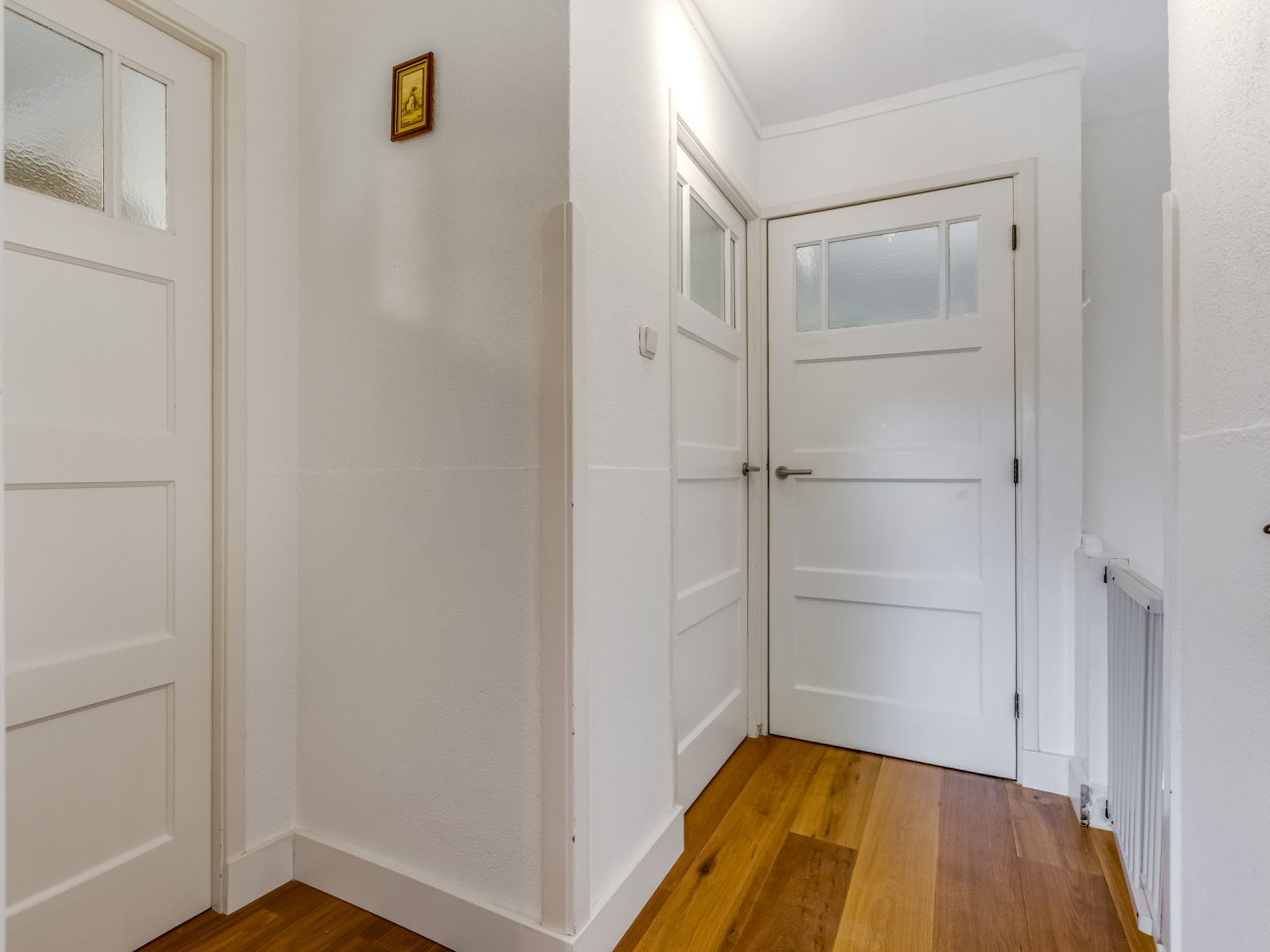 Overloop die toegang biedt tot alle ruimtes en een vaste kast. Aan de voorzijde bevindt zich de ouderslaapkamer en de badkamer. De badkamer (2018) met raam voor natuurlijk daglicht is voorzien van een breed wastafelmeubel met verwarmde spiegel, inloopdouche met hand- en stortdouche met thermostaatkraan, een handdoekradiator en mechanische ventilatie. Aan de achterzijde bevinden zich nog twee slaapkamers.