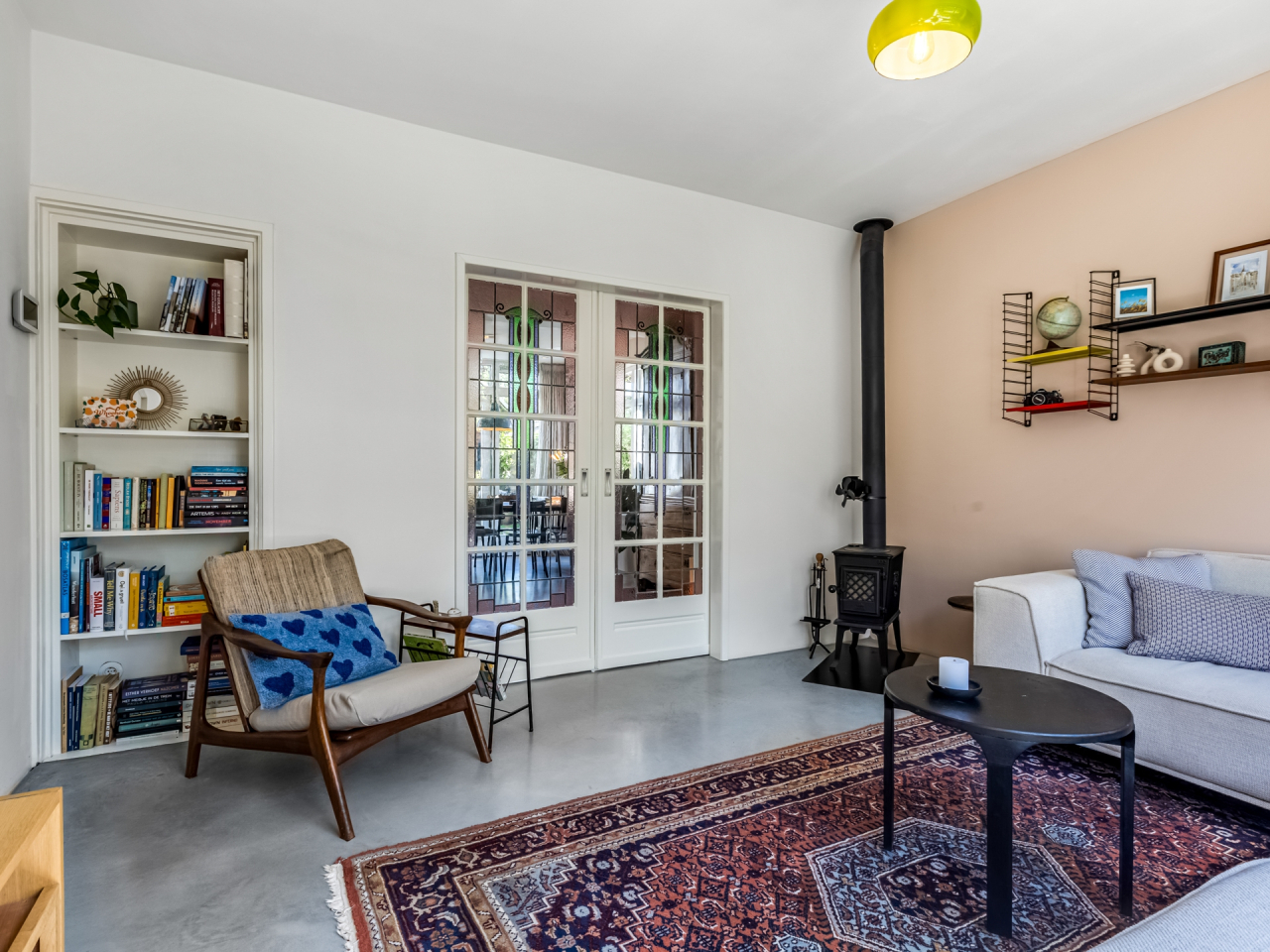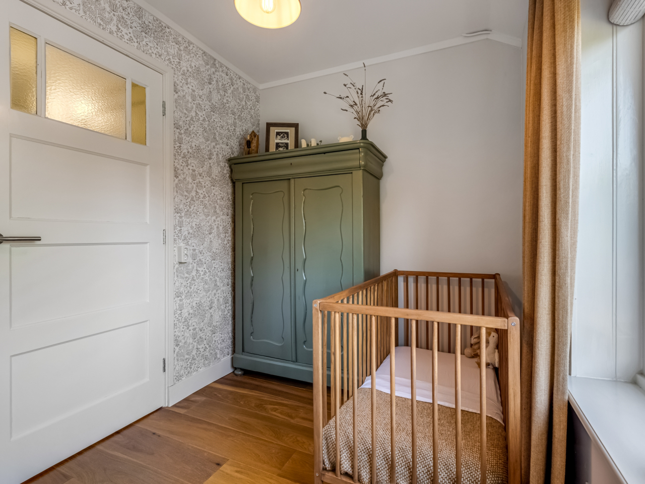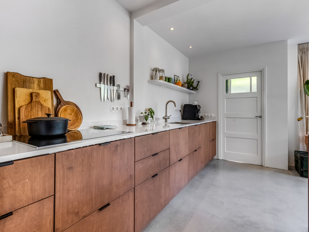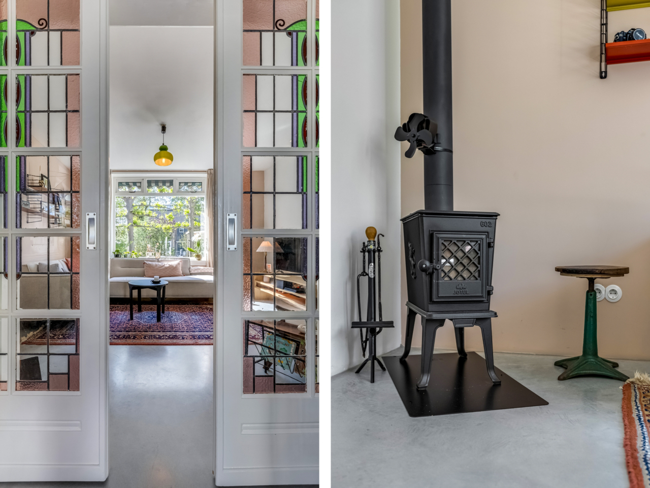 Hal/entree met moderne meterkast (2022 - 12 groepen en drie aardlekschakelaars), toiletruimte met zwevend toilet en fonteintje, een praktische kelder en de trapopgang naar de eerste verdieping. Via de hal bereikt u zowel de zitkamer (voorzijde) als de uitgebouwde eetkeuken (achterzijde). De open keuken (2022) is voorzien van een licht composieten werkblad met spoelbak en kokend waterkraan, 4 zone- inductiekookplaat, afzuigkap, oven, combi-magnetron, vaatwasser, koel- vriescombinatie en voldoende opbergkasten. Aansluitend aan de open keuken vindt u de ruime eethoek met openslaande deuren naar de achtertuin. Het geheel is door de vele ramen aangenaam licht. In de bijkeuken zijn een ingebouwde opbergkast, een wasbak, de witgoedaansluitingen en eveneens een deur die toegang biedt tot de achtertuin. Door houten en suite deuren met glas- in- lood wordt de eetkeuken gescheiden van de lichte zitkamer. Een houtkachel zorgt in de koude dagen voor extra warmte en gezelligheid.