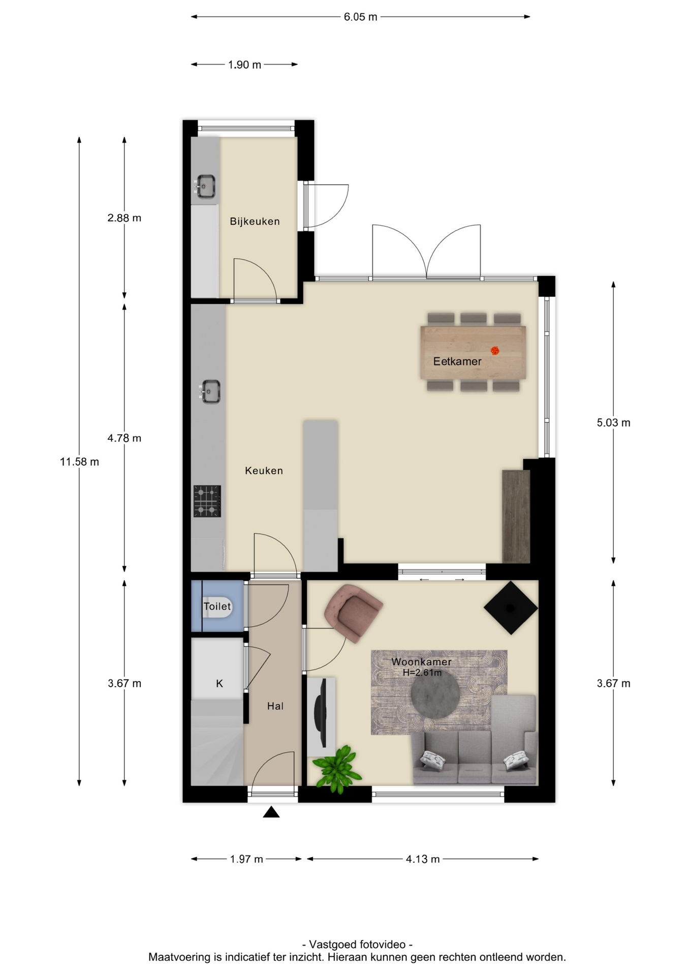 Deze informatie is door ons met de nodige zorgvuldigheid samengesteld. Onzerzijds wordt echter geen enkele aansprakelijkheid aanvaard voor enige onvolledigheid, onjuistheid of anderszins, dan wel de gevolgen daarvan. Alle opgegeven maten en oppervlakten zijn indicatief. Van toepassing zijn de VBO consumenten voorwaarden.