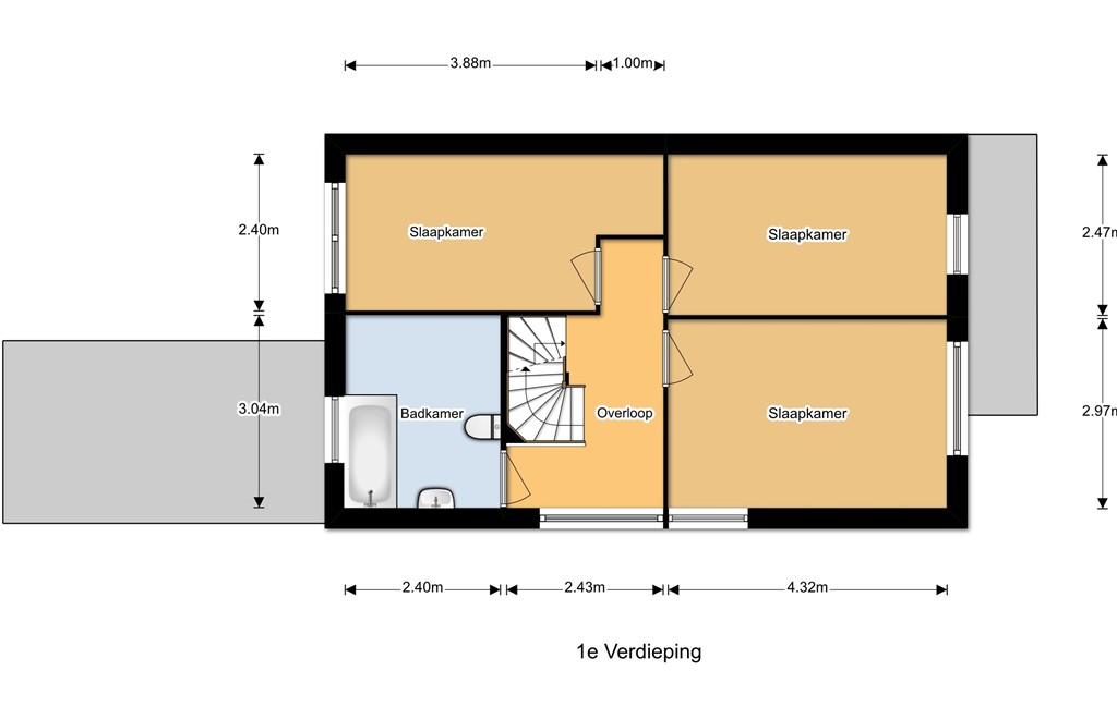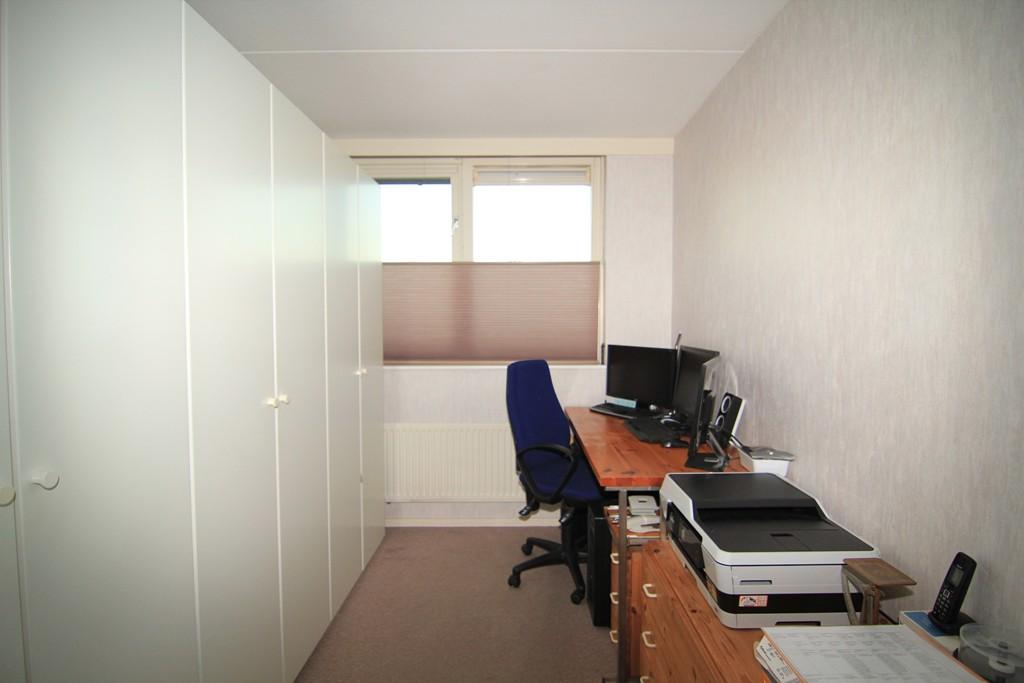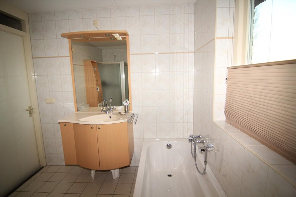 Overloop, twee slaapkamers aan de voorzijde van de woning. Derde slaapkamer, thans in gebruik als werkkamer, aan de achterzijde. Ruime badkamer voorzien van een ligbad, douchecabine, toilet, wastafelmeubel en radiator. De badkamer is geheel betegeld en voorzien van een raam voor ventilatie.