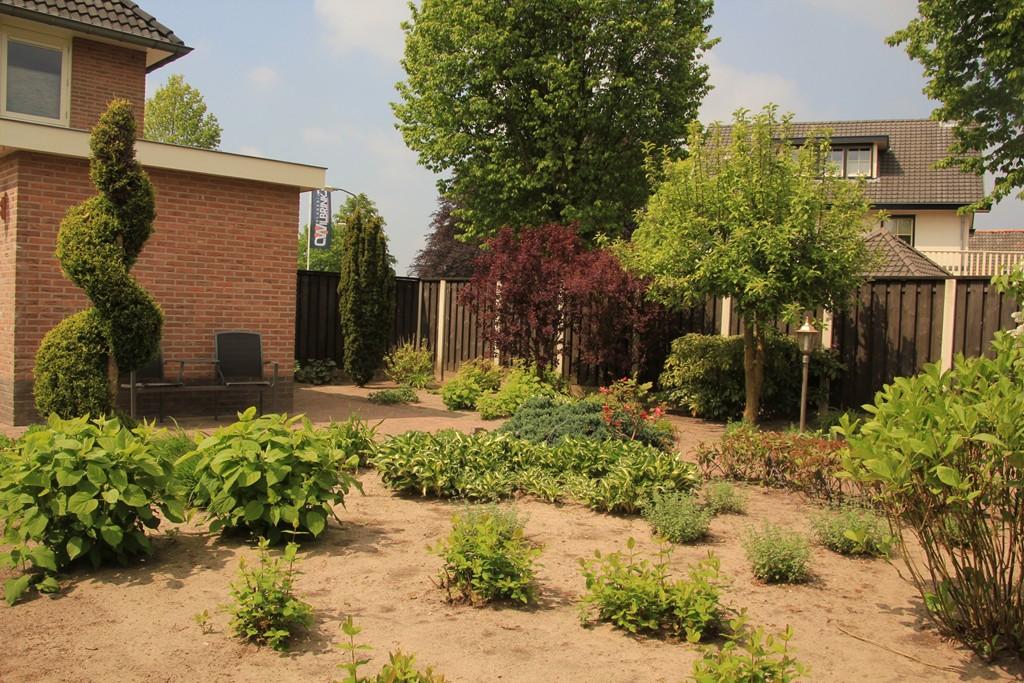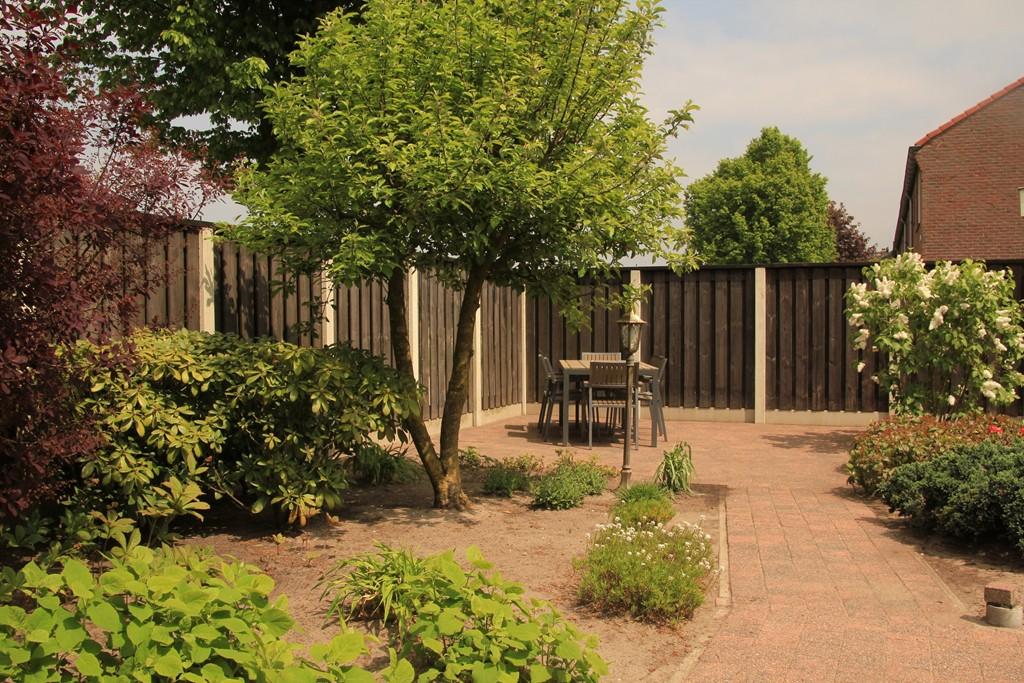 Fraai aangelegde tuin, deels bestraat en deels beplant en omheind voor veel privacy.