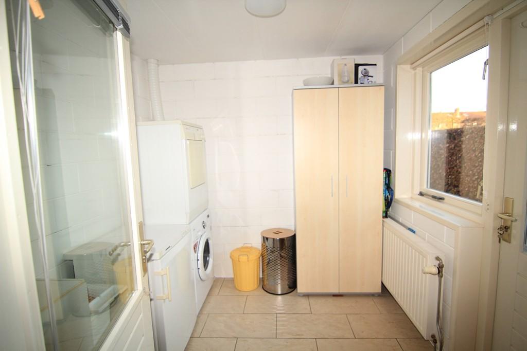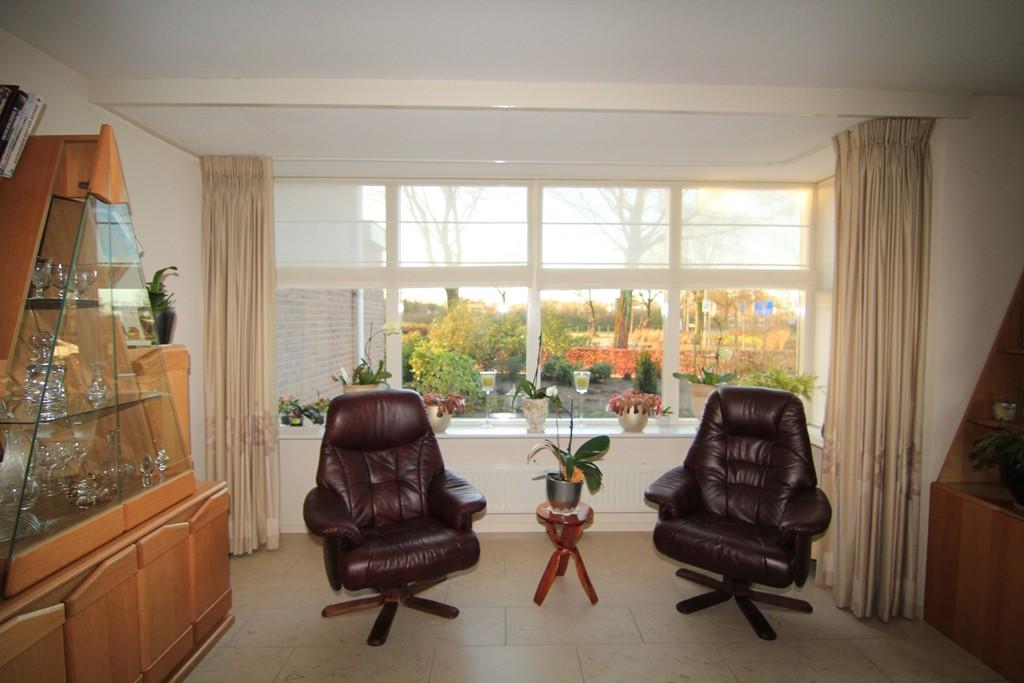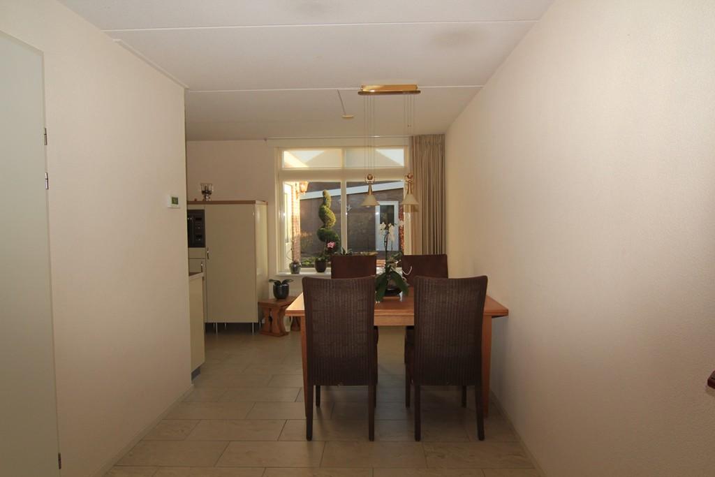Entree, hal, garderobenis, meterkast en toilet met fonteintje. Ruime L-vormige woonkamer met een erker en veel lichtinval door een extra raam in de zijgevel. De woonkamer is voorzien van een plavuizenvloer met vloerverwarming. Eethoek met zicht op de achtertuin. Halfopen luxe keuken in lichte kleurstelling en voorzien van diverse inbouwapparatuur zoals een koelkast, combimagnetron, vaatwasmachine (vernieuwd in 2014), een inductiekookplaat en een afzuigkap. In de uitbouw aan de achterzijde van de woning bevindt zich de bijkeuken met aansluitingen voor de wasapparatuur en nog een berging.