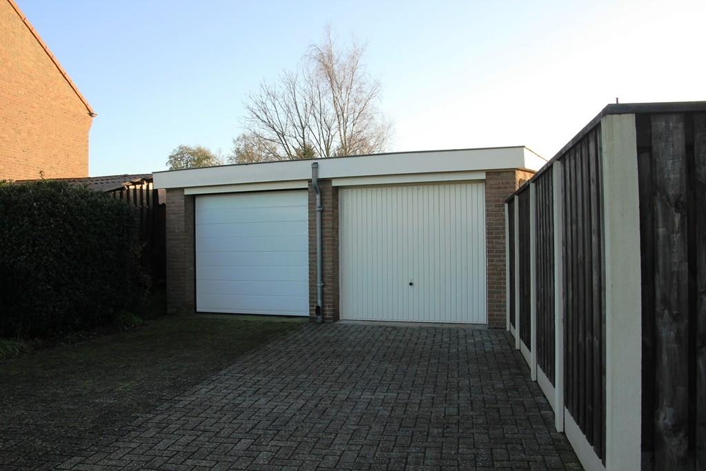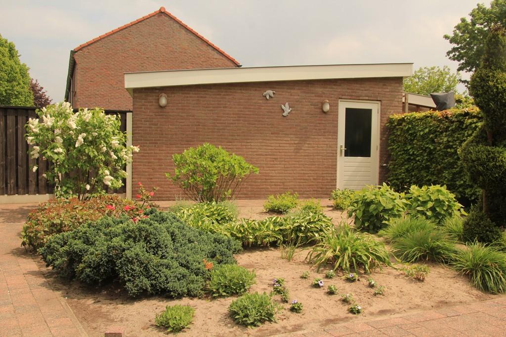 Achtertuin op het oosten, ca. 16 x 12 meter met buitenverlichting en achterom. Aangbouwde stenen berging en vrijstaande stenen garage met elektra en loopdeur naar de tuin. Voldoende parkeergelegenheid voor meerdere auto's op eigen terrein.