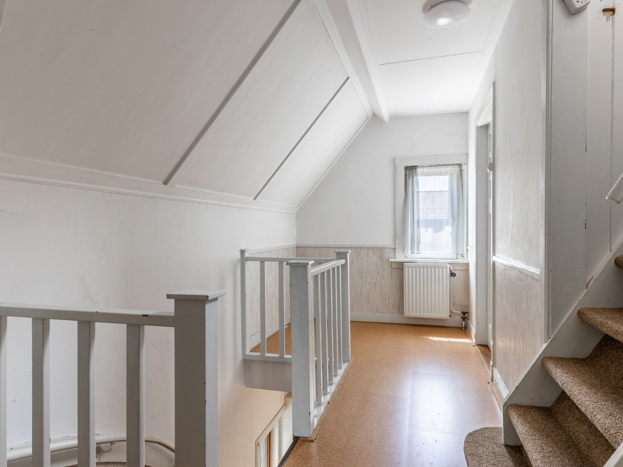 Op de overloop ziet u nog mooie houten trapleuningen, een houten gebinte en de originele paneeldeuren. Ook deze woonlaag is door de aanwezigheid van de vele ramen erg licht.