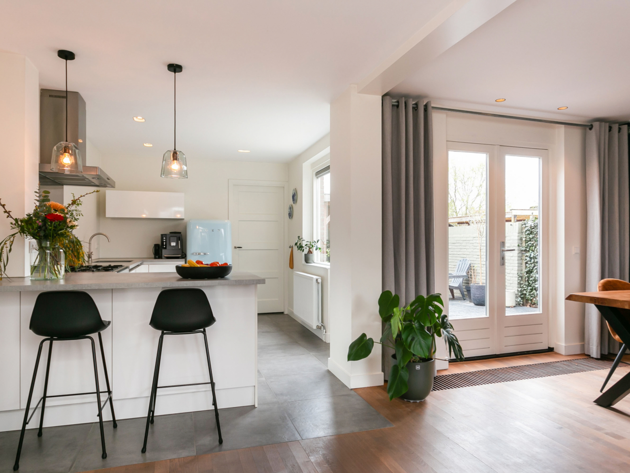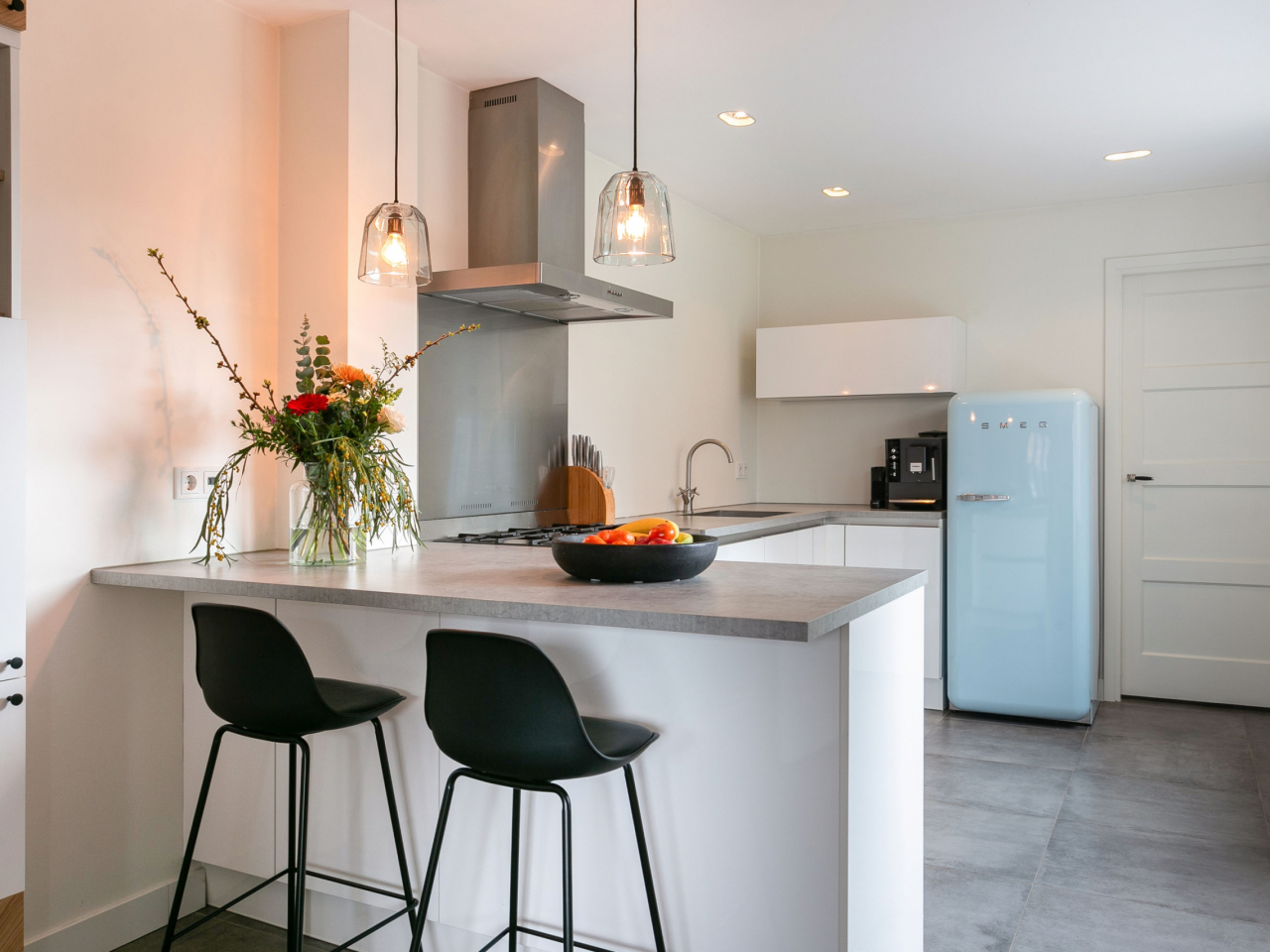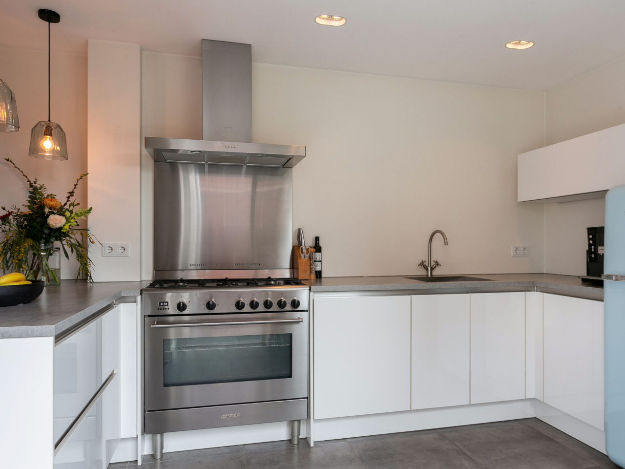 Entree, lichte hal met trapopgang, vernieuwde meterkast/elektra (2016) en praktische kelderkast. Toiletruimte met zwevend toilet, fonteintje en een mooie tegelvloer. Sfeervolle woonkamer met houten vloer en een gezellige houtkachel, de aangewezen plek om te genieten van een goed boek of gesprek. De openslaande deuren geven direct toegang tot de zonnige achtertuin. Uitgebouwde open keuken (Brugman - 2016) met schiereiland voorzien van een royaal werkblad, stoer Smeg fornuis met 5 gaspitten, grote oven, afzuigkap, ijsblauwe Smeg koelkast (ter overname) en een vaatwasser. Het plafond van de keuken is voorzien van spotjes. Achter de keuken bevind zich nog de bijkeuken met aansluitingen voor de was-apparatuur.
