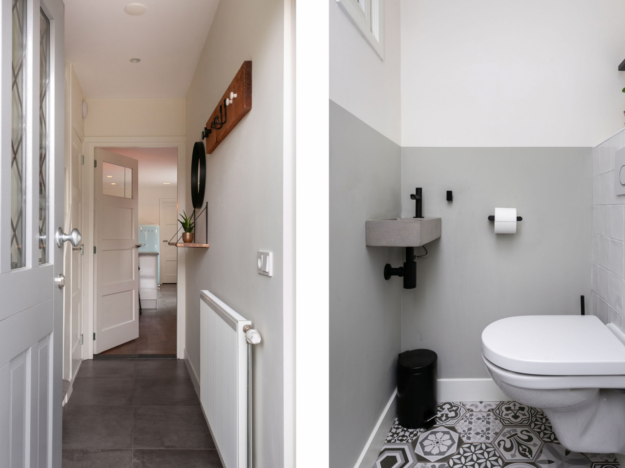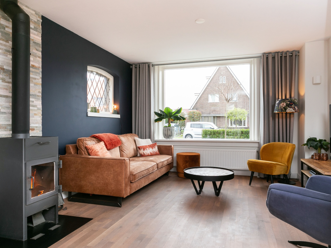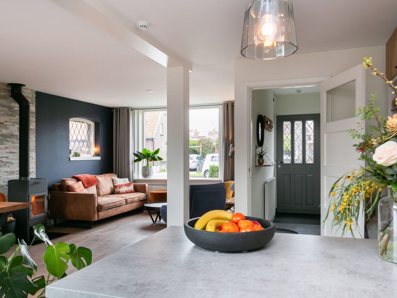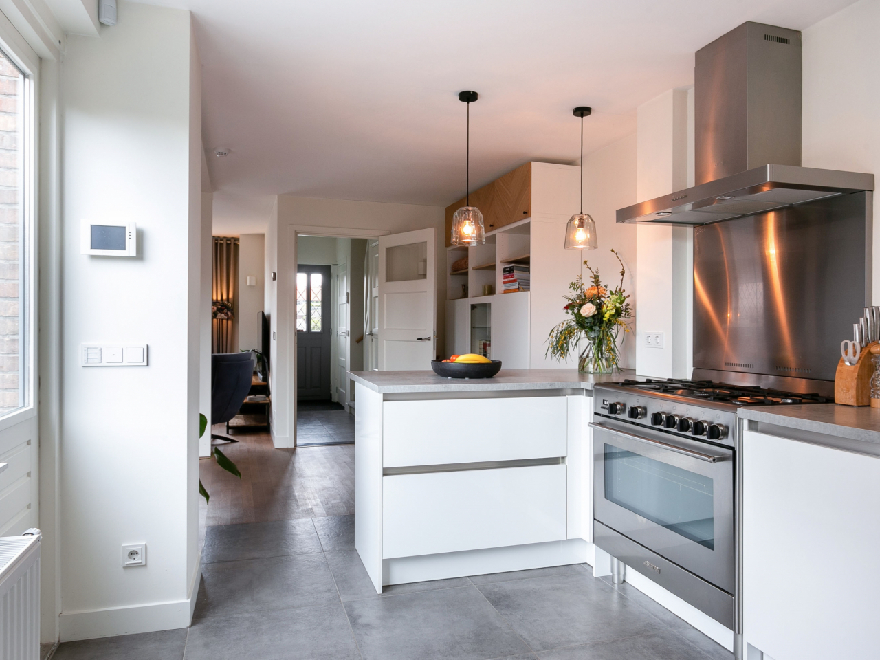 Entree, lichte hal met trapopgang, vernieuwde meterkast/elektra (2016) en praktische kelderkast. Toiletruimte met zwevend toilet, fonteintje en een mooie tegelvloer. Sfeervolle woonkamer met houten vloer en een gezellige houtkachel, de aangewezen plek om te genieten van een goed boek of gesprek. De openslaande deuren geven direct toegang tot de zonnige achtertuin. Uitgebouwde open keuken (Brugman - 2016) met schiereiland voorzien van een royaal werkblad, stoer Smeg fornuis met 5 gaspitten, grote oven, afzuigkap, ijsblauwe Smeg koelkast (ter overname) en een vaatwasser. Het plafond van de keuken is voorzien van spotjes. Achter de keuken bevind zich nog de bijkeuken met aansluitingen voor de was-apparatuur.