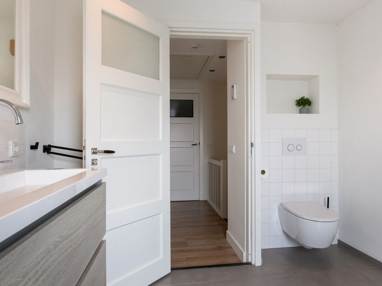 Overloop met airco (2021) die toegang biedt tot alle ruimten. Twee ruime slaapkamers met laminaatvloeren waarbij de ouderslaapkamer zich aan de achterkant van de woning bevindt. Moderne en ruime badkamer (2016) voorzien van vloerverwarming, wastafelmeubel met twee kranen, spiegel met ingebouwde anti-condens verwarming , inloopdouche met handdouche en regendouche, 2e toilet, plafond met inbouwspotjes en een raam voor natuurlijk daglicht. Daarnaast is er nog een inloopkast (voorheen badkamer). De trap is in 2022 voorzien van tapijt.