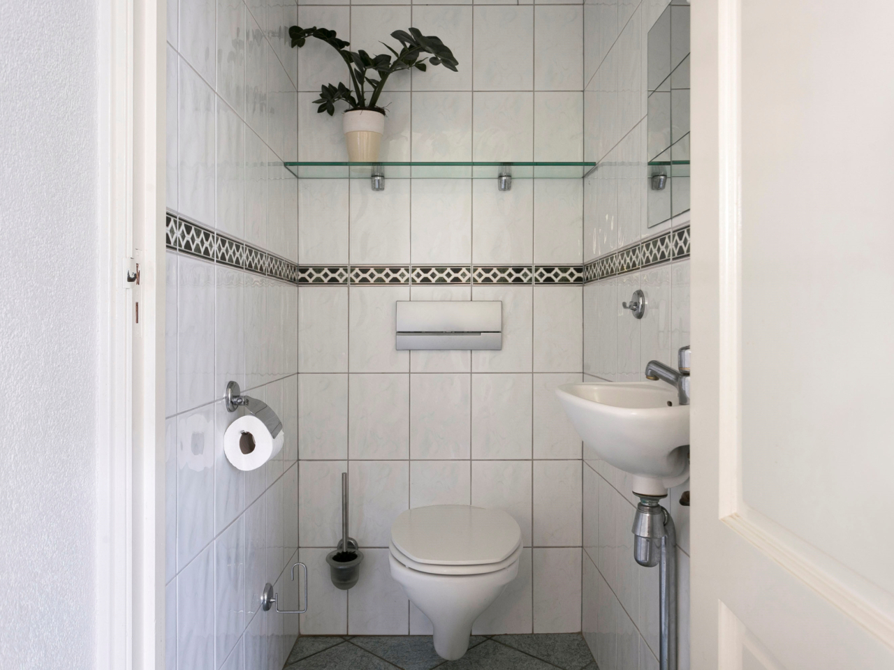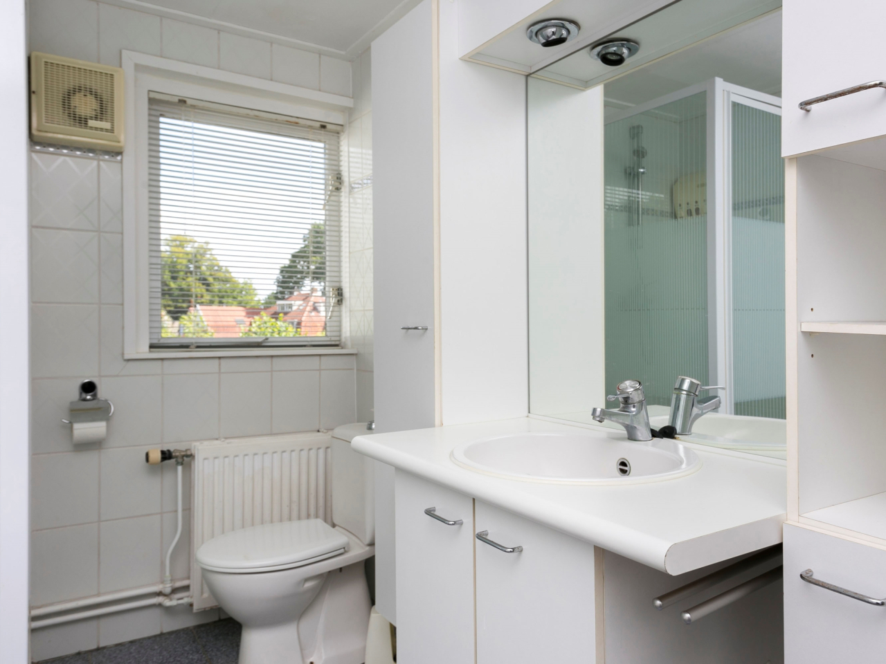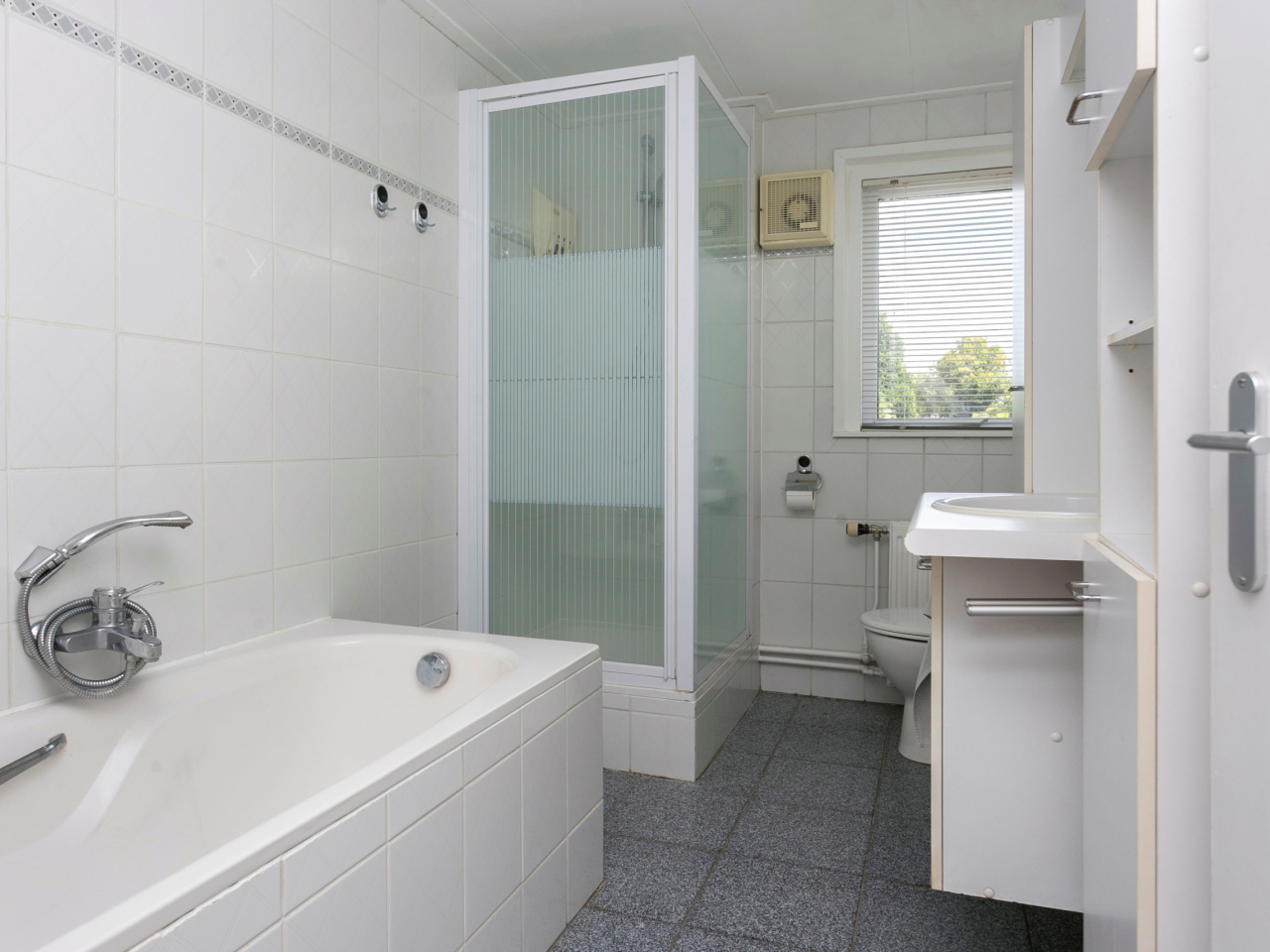 Volledig betegelde ruime badkamer voorzien van een wastafelmeubel, douchecabine, bad, 2e toilet, radiator, ventilatie en een raam voor fijn natuurlijk daglicht.