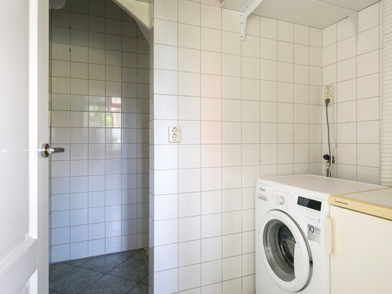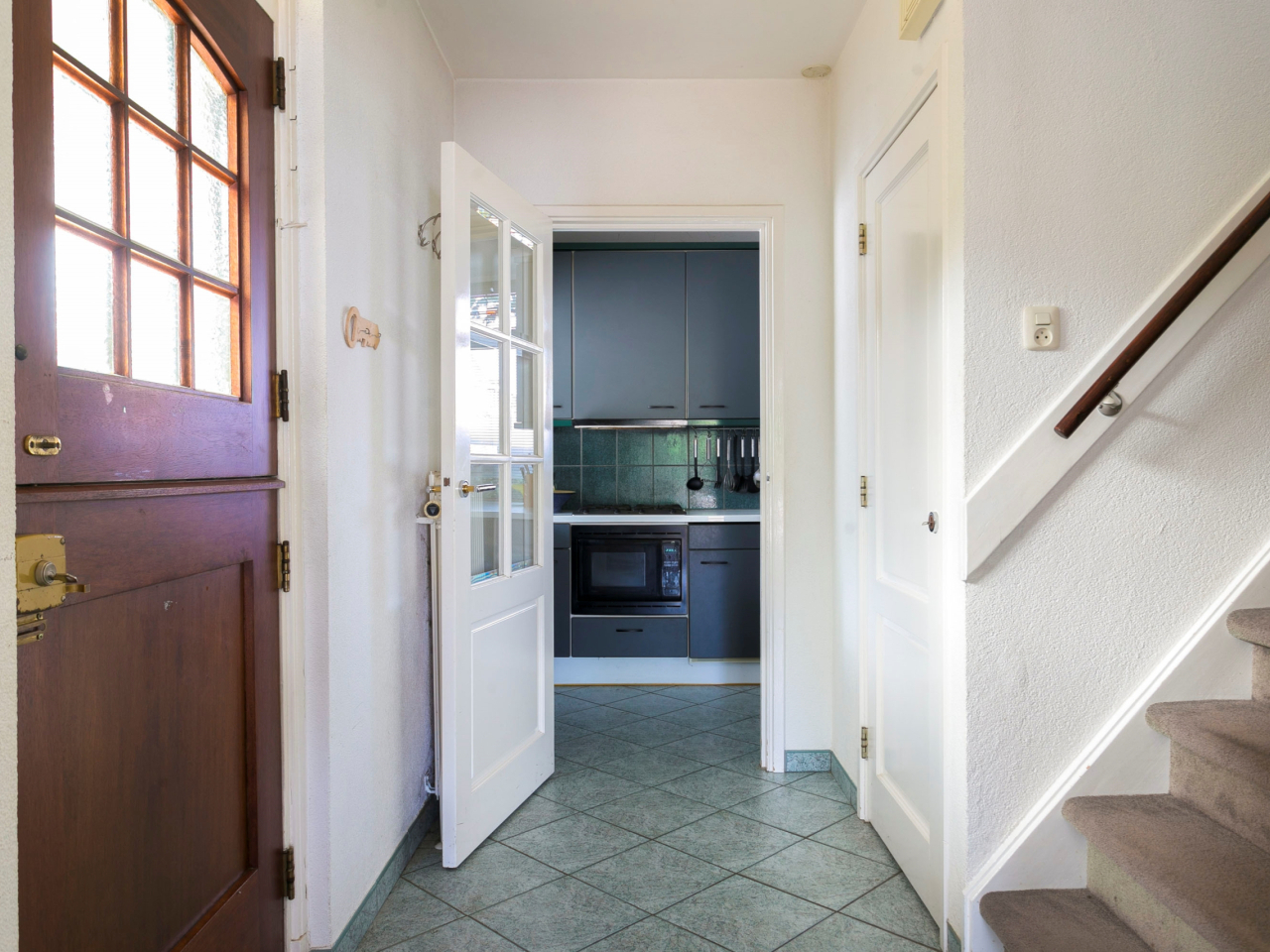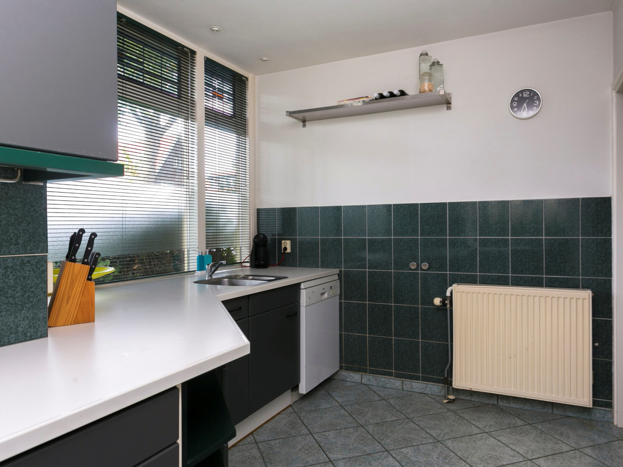 Hal met tegelvloer, trapopgang, meterkast, volledig betegelde toiletruimte met zwevend toilet en fonteintje. Ruime separate keuken gelegen aan de voorkant van de woning en voorzien van een royaal werkblad, 1½ spoelbak, 4 pits gaskookplaat, afzuigkap, combi-oven, koelkast, vaatwasser en voldoende opbergruimte. De keuken heeft, door de aanwezigheid van een erker met glas-in-lood (v.v. dubbel glas) bovenramen en van een extra zijraam, veel daglicht. Aansluitend aan de keuken bevindt zich de volledig betegelde bijkeuken met aansluitingen voor de was-apparatuur en toegang tot de kelder (8 m²).