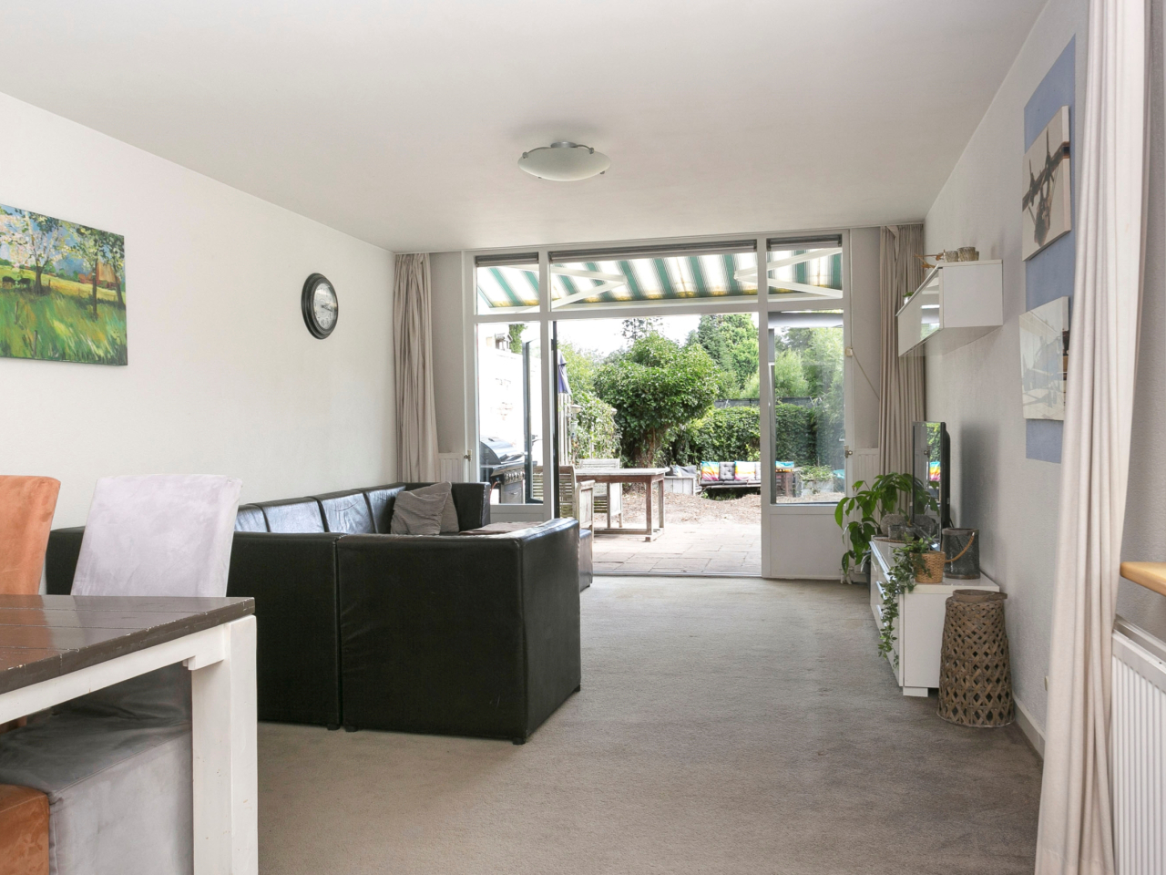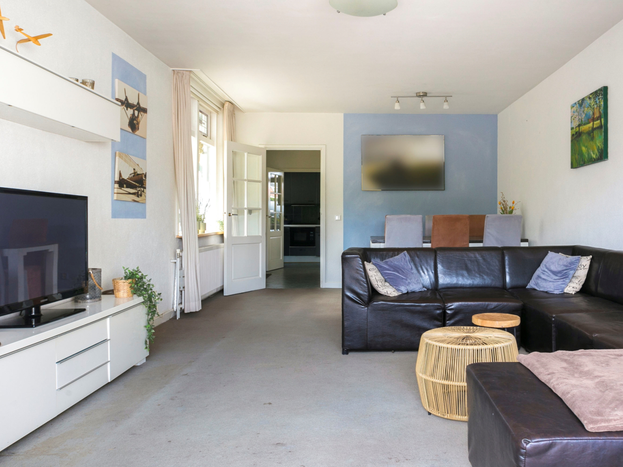 Lichte woonkamer met wederom karakteristieke jaren ’30 details als openslaande deuren met bovenramen die toegang bieden tot de achtertuin met een terras voorzien van een elektrisch zonnescherm. De woonkamer heeft eveneens een zijraam met prachtige glas-in-lood bovenramen.