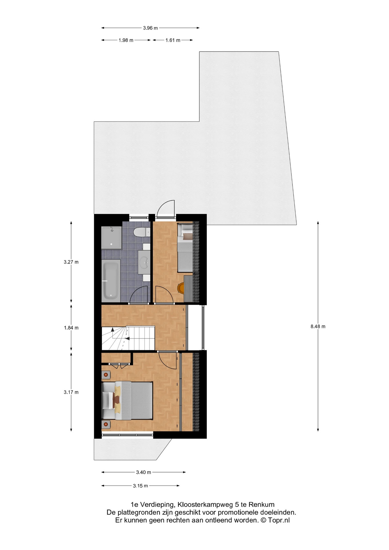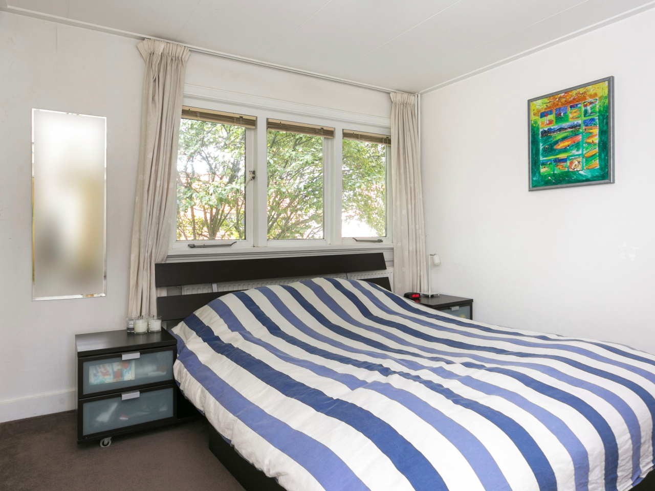 Aan de achterkant bevindt zich een 2e slaapkamer met een deur naar het platte dak en de badkamer.