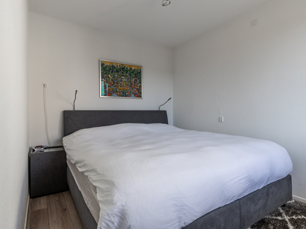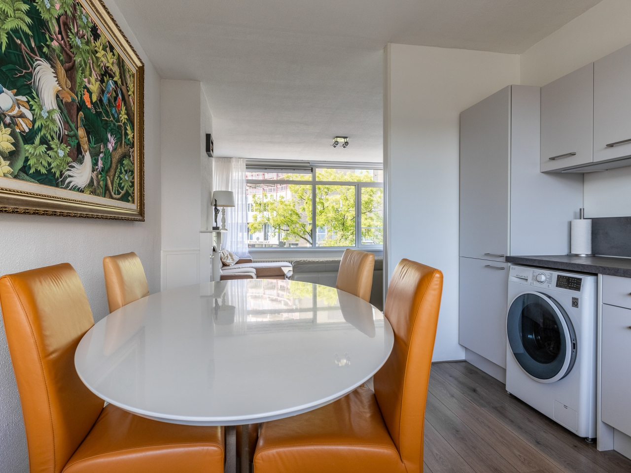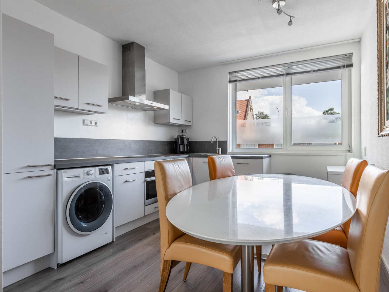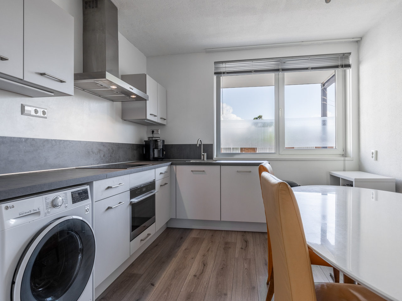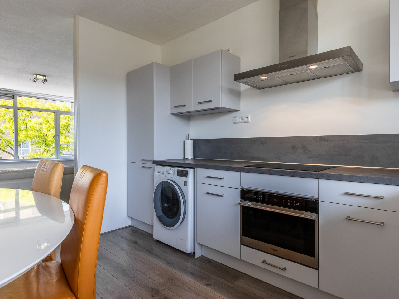 De moderne en ruime eetkeuken is gelegen aan de galerijkant en is voorzien van een spoelbak, een aanrechtblad met voldoende werkruimte, inductie kookplaat met 4 zones, afzuigkap, combi-oven, koel/vriescombinatie, wasmachine aansluiting en voldoende opbergruimte. Door de ruime afmetingen is hier eveneens voldoende plek voor een goede eettafel. Voorts zijn er nog drie lichte slaapkamers eveneens voorzien van een mooie laminaatvloer.